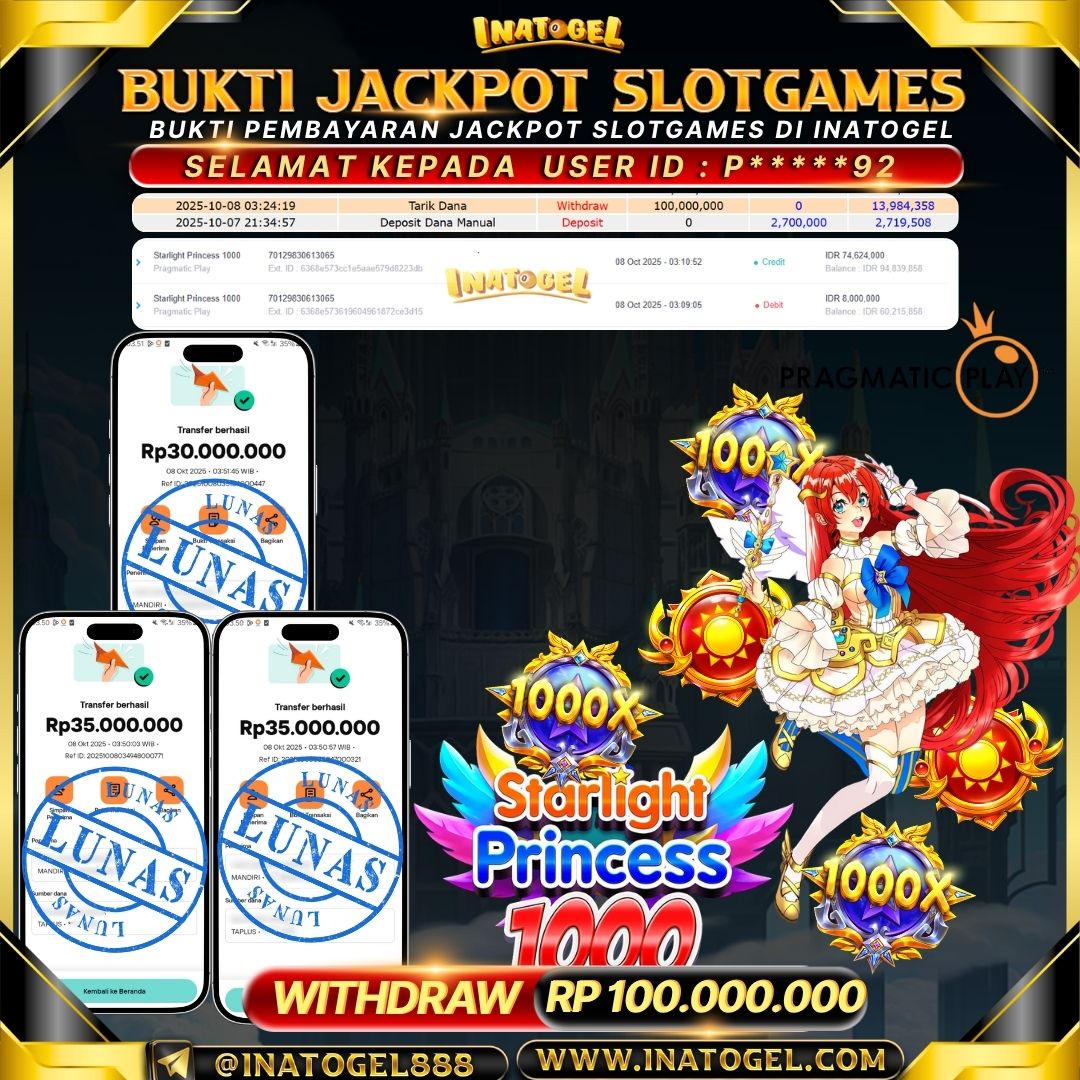 Selamat kepada User Id O***92 telah berhasil mendapatkan kemenangan jackpot pada permainan SlotGame Starlight Princess 1000 Inatogel sebesar Rp100,000,000,- . Inatogel situs terpercaya sejak dulu hingga saat ini , Untuk kemenangan berapapun pasti akan kami bayarkan . Jangan ragu bermain di Ina Togel . Kami pihak Inatogel Menyampaikan terima kasih kepada seluruh member Ina Togel yang telah Percaya dan setia Bersama kami bermain di Inatogel hingga saat ini.