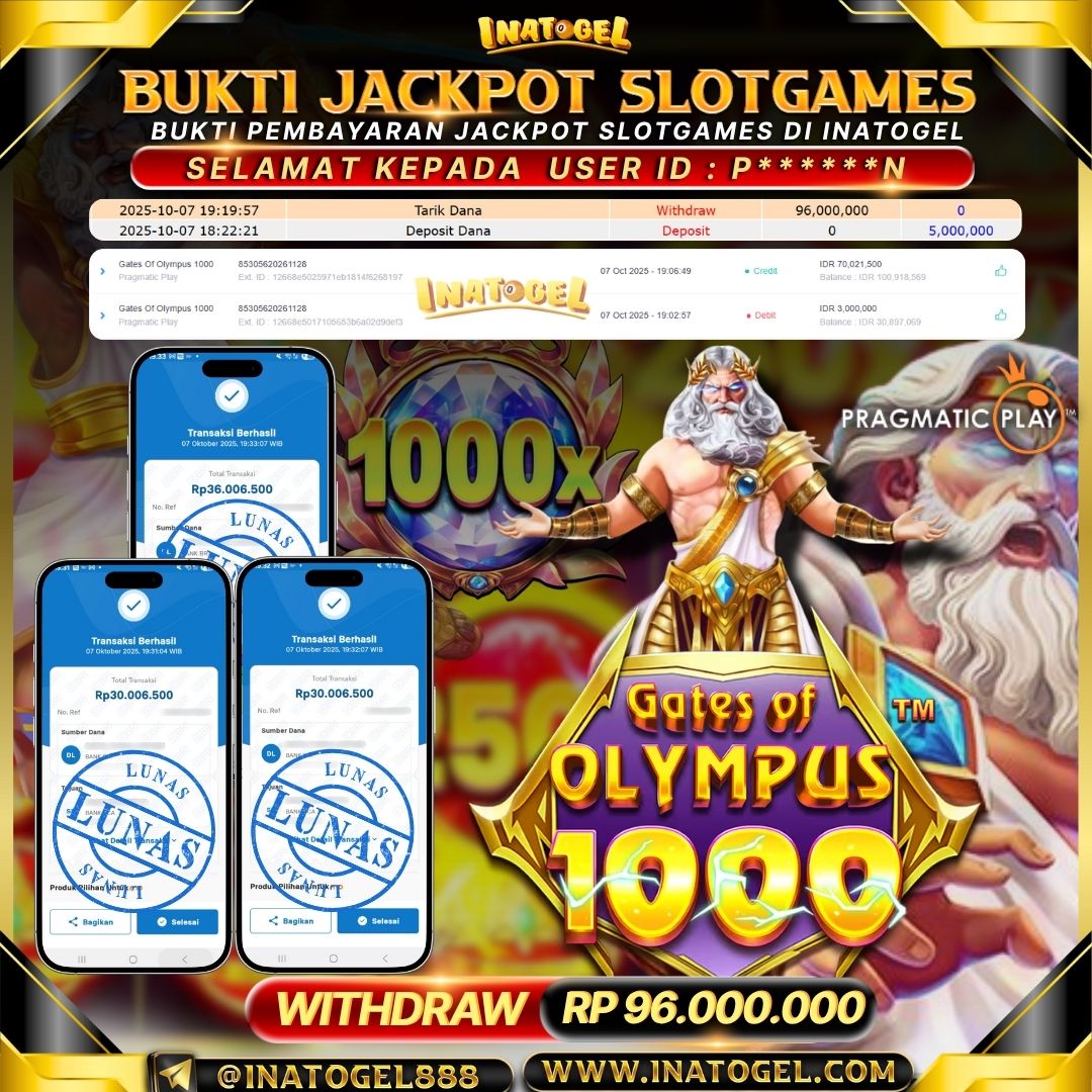 Selamat kepada User Id P******N telah berhasil mendapatkan kemenangan jackpot pada permainan SlotGame Gates Of Olympus 1000 Inatogel sebesar Rp96,000,000,- . Inatogel situs terpercaya sejak dulu hingga saat ini , Untuk kemenangan berapapun pasti akan kami bayarkan . Jangan ragu bermain di Ina Togel . Kami pihak Inatogel Menyampaikan terima kasih kepada seluruh member Ina Togel yang telah Percaya dan setia Bersama kami bermain di Inatogel hingga saat ini.