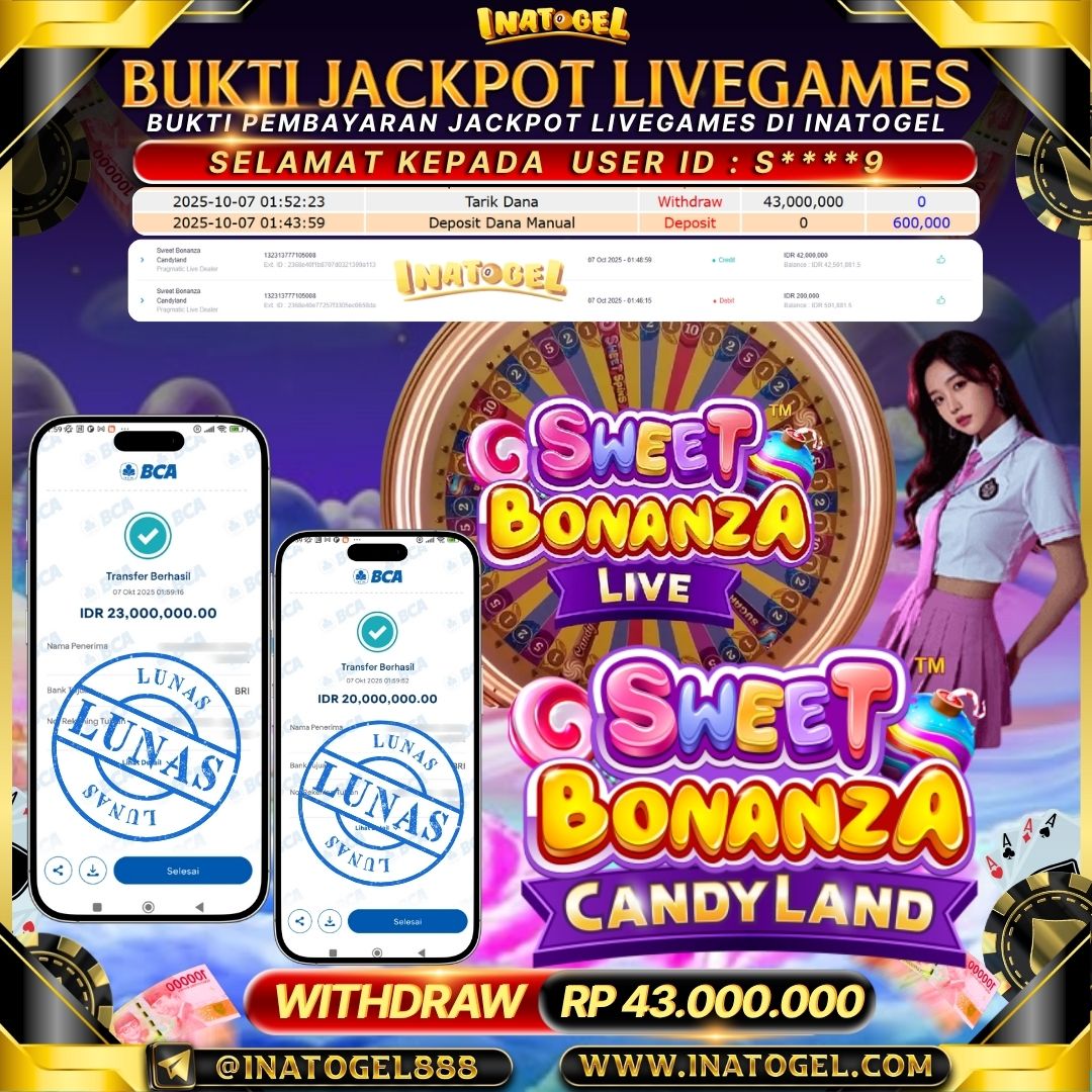Selamat kepada User Id S****9 telah berhasil mendapatkan kemenangan jackpot pada permainan LiveGame PP Live Sweet Bonanza Candyland Inatogel sebesar Rp43,000,000,- Inatogel situs terpercaya sejak dulu hingga saat ini , Untuk kemenangan berapapun pasti akan kami bayarkan . Jangan ragu bermain di Ina Togel . Kami pihak Inatogel Menyampaikan terima kasih kepada seluruh member Ina Togel yang telah Percaya dan setia Bersama kami bermain di Inatogel hingga saat ini.
