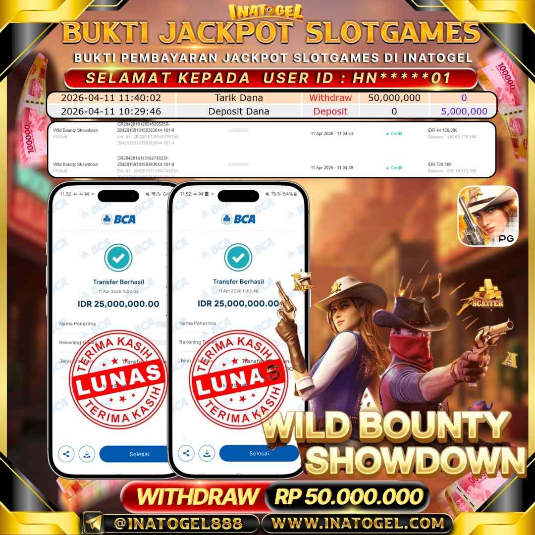 Selamat kepada User Id N***A telah berhasil mendapatkan kemenangan jackpot pada permainan Slot Games Wild Bounty Showdown sebesar Rp 40,000,000- . Inatogel situs terpercaya sejak dulu hingga saat ini , Untuk kemenangan berapapun pasti akan kami bayarkan . Jangan ragu bermain di Ina Togel . Kami pihak Inatogel Menyampaikan terima kasih kepada seluruh member Ina Togel yang telah Percaya dan setia Bersama kami bermain di Inatogel saat ini.