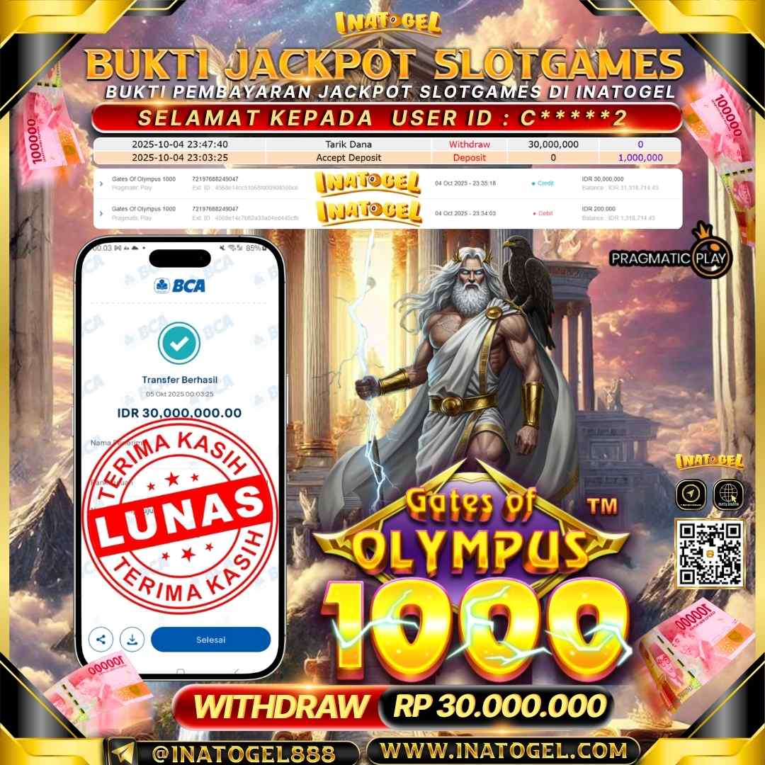 Selamat kepada User Id C****12 telah berhasil mendapatkan kemenangan jackpot pada permainan SlotGame Gates Of Olympus 1000 Inatogel sebesar Rp30,000,000,- . Inatogel situs terpercaya sejak dulu hingga saat ini , Untuk kemenangan berapapun pasti akan kami bayarkan . Jangan ragu bermain di Ina Togel . Kami pihak Inatogel Menyampaikan terima kasih kepada seluruh member Ina Togel yang telah Percaya dan setia Bersama kami bermain di Inatogel hingga saat ini.