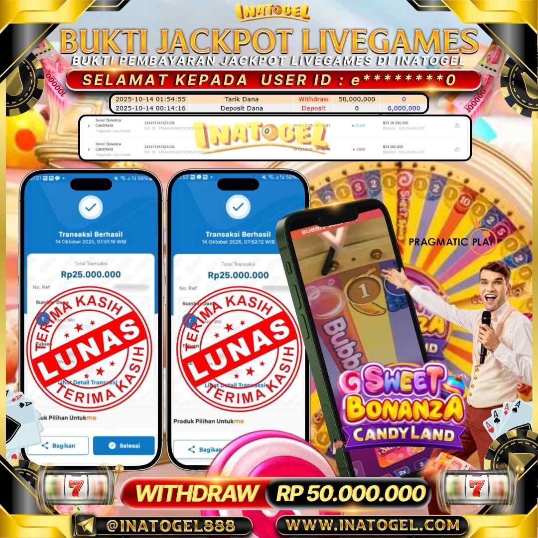 Selamat kepada User Id E********0 telah berhasil mendapatkan kemenangan jackpot pada permainan LiveGame PP Live Sweet Bonanza Candyland Inatogel sebesar Rp50,000,000,- Inatogel situs terpercaya sejak dulu hingga saat ini , Untuk kemenangan berapapun pasti akan kami bayarkan . Jangan ragu bermain di Ina Togel . Kami pihak Inatogel Menyampaikan terima kasih kepada seluruh member Ina Togel yang telah Percaya dan setia Bersama kami bermain di Inatogel hingga saat ini.