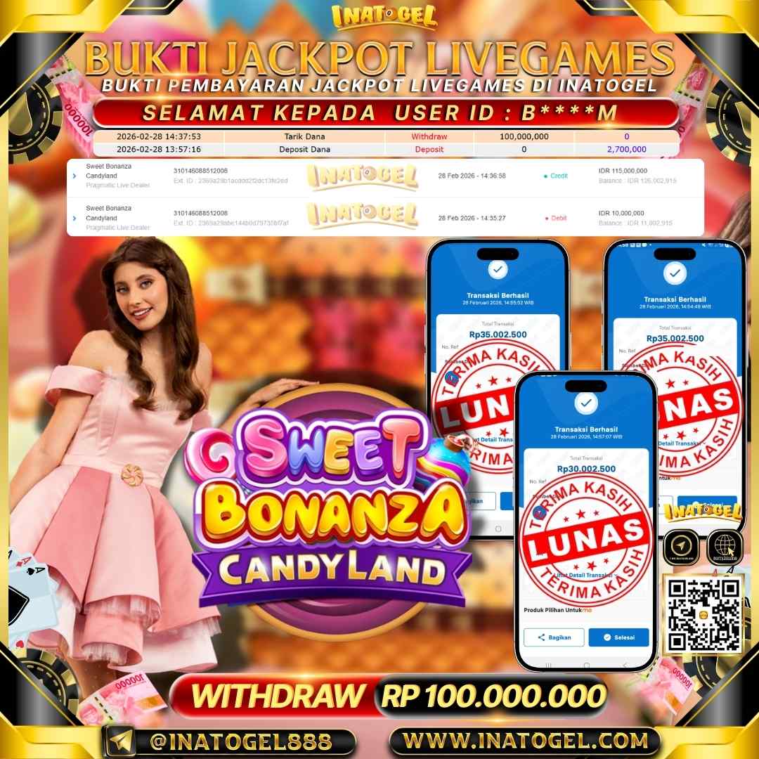 Selamat kepada User Id B****M telah berhasil mendapatkan kemenangan jackpot pada permainan Live Game Bonanza Candyland Inatogel sebesar Rp 100,000,000,- Inatogel situs terpercaya sejak dulu hingga saat ini , Untuk kemenangan berapapun pasti akan kami bayarkan . Jangan ragu bermain di Ina Togel . Kami pihak Inatogel Menyampaikan terima kasih kepada seluruh member Ina Togel yang telah Percaya dan setia Bersama kami bermain di Inatogel hingga saat ini.