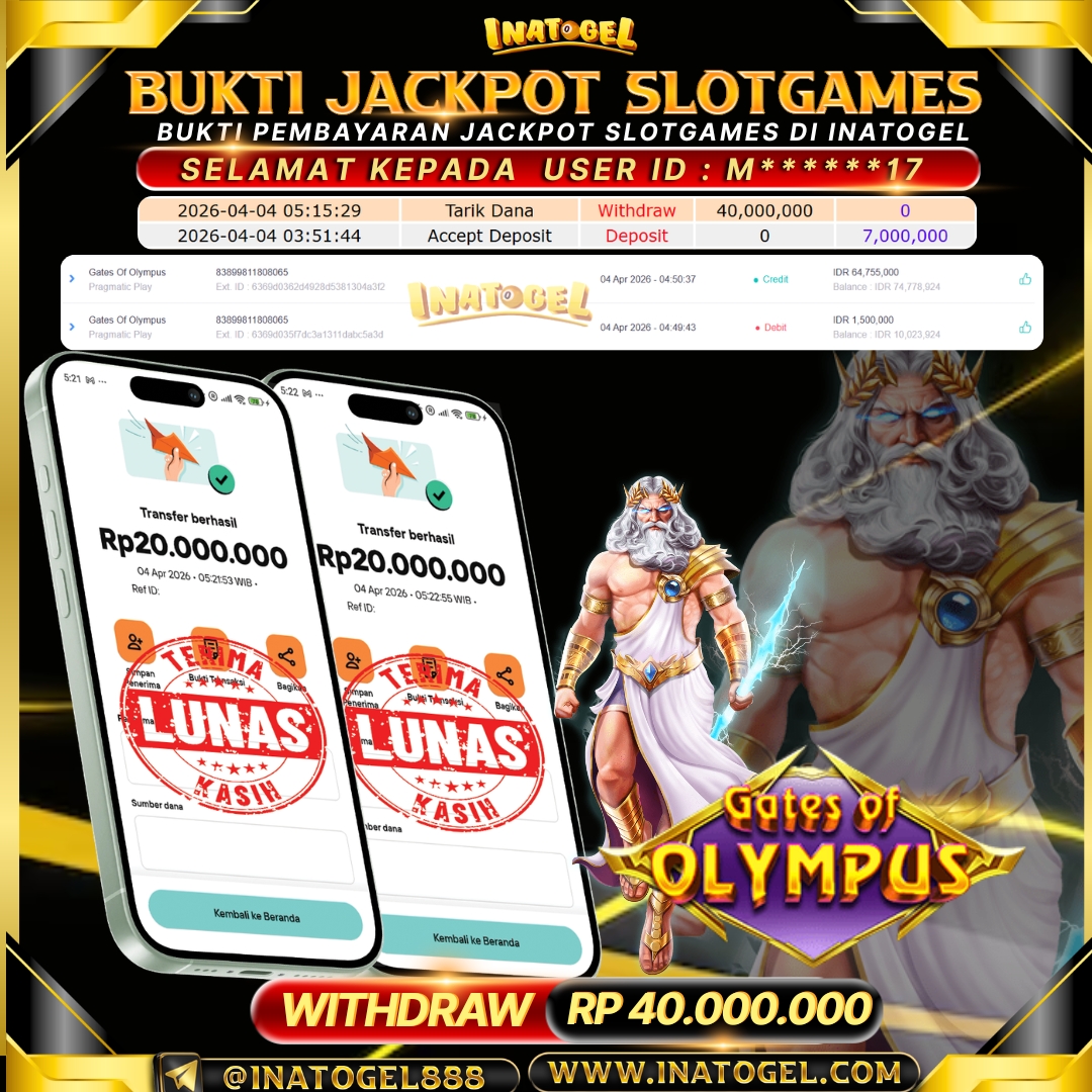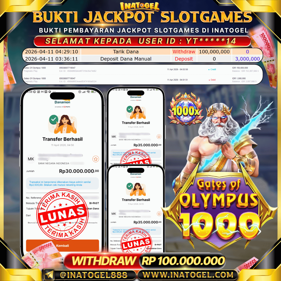 Selamat kepada User Id B****M telah berhasil mendapatkan kemenangan jackpot pada permainan Slot Games Gates Of Olympus Super Scatte sebesar Rp 71,500,000- . Inatogel situs terpercaya sejak dulu hingga saat ini , Untuk kemenangan berapapun pasti akan kami bayarkan . Jangan ragu bermain di Ina Togel . Kami pihak Inatogel Menyampaikan terima kasih kepada seluruh member Ina Togel yang telah Percaya dan setia Bersama kami bermain di Inatogel saat ini.