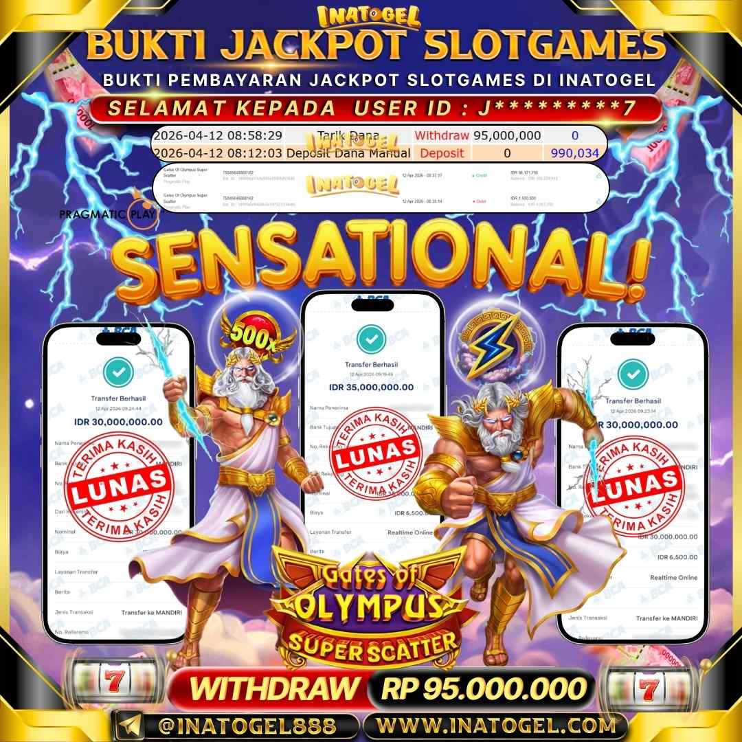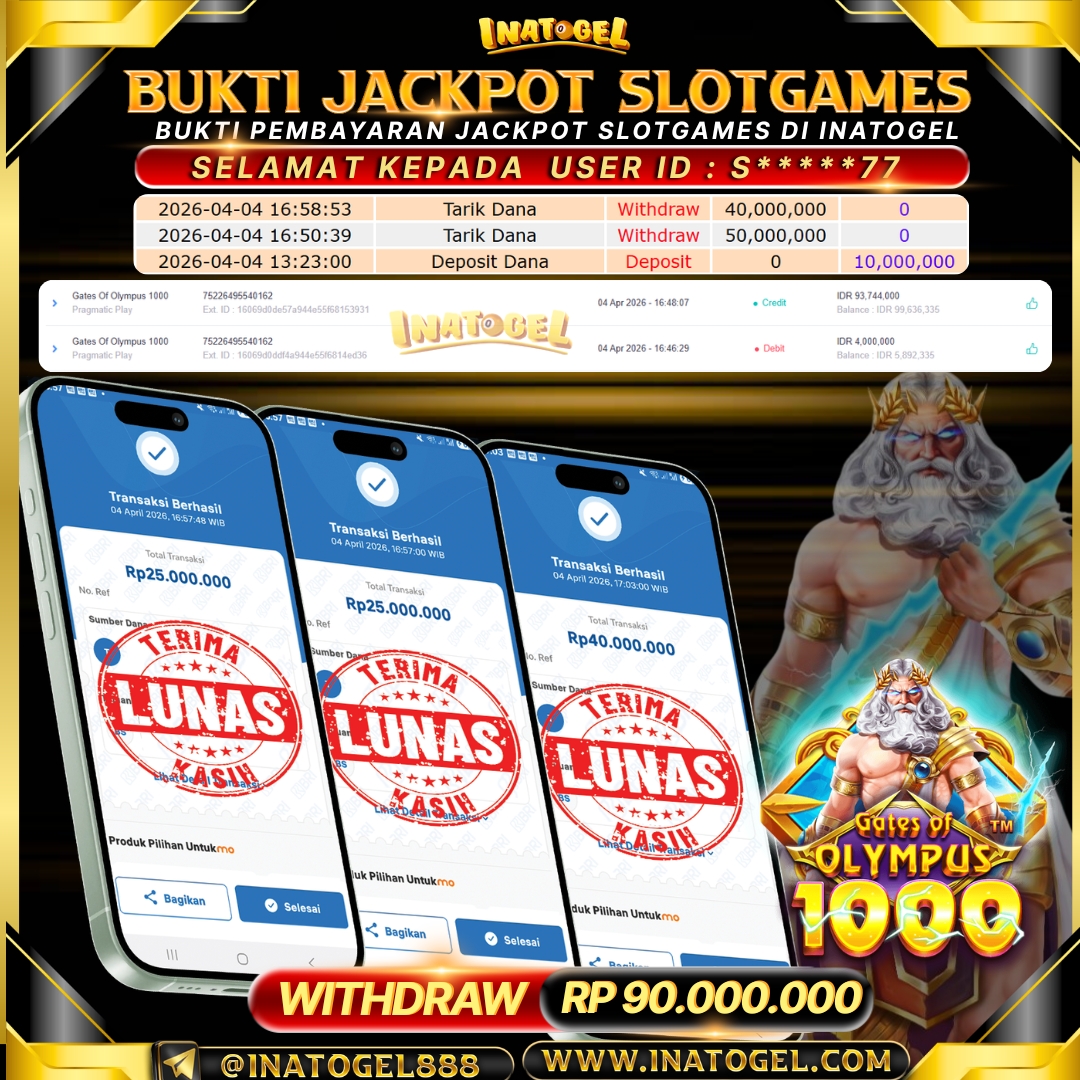 Selamat kepada User Id P******38 telah berhasil mendapatkan kemenangan jackpot pada permainan Slot Games Gates Of Olympus Super Scatte sebesar Rp 90,000,000- . Inatogel situs terpercaya sejak dulu hingga saat ini , Untuk kemenangan berapapun pasti akan kami bayarkan . Jangan ragu bermain di Ina Togel . Kami pihak Inatogel Menyampaikan terima kasih kepada seluruh member Ina Togel yang telah Percaya dan setia Bersama kami bermain di Inatogel saat ini.