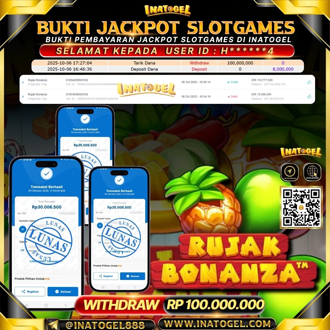Selamat kepada User Id H*****34 telah berhasil mendapatkan kemenangan jackpot pada permainan SlotGame Rujak Bonanza Inatogel sebesar Rp100,000,000,- . Inatogel situs terpercaya sejak dulu hingga saat ini , Untuk kemenangan berapapun pasti akan kami bayarkan . Jangan ragu bermain di Ina Togel . Kami pihak Inatogel Menyampaikan terima kasih kepada seluruh member Ina Togel yang telah Percaya dan setia Bersama kami bermain di Inatogel hingga saat ini.