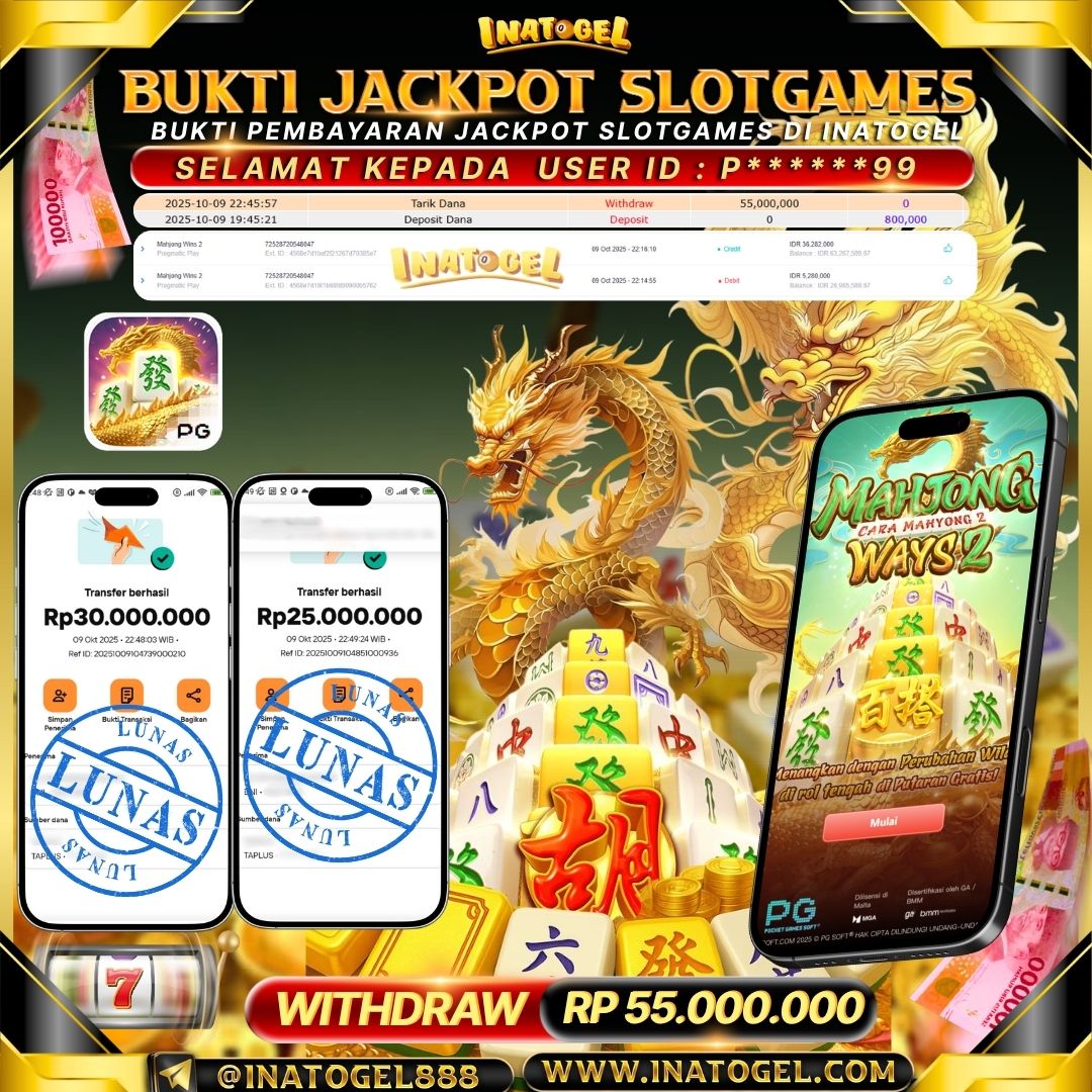 Selamat kepada User Id N*******8 telah berhasil mendapatkan kemenangan jackpot pada permainan SlotGame Mahjong Ways 2 Inatogel sebesar Rp55,000,000,- . Inatogel situs terpercaya sejak dulu hingga saat ini , Untuk kemenangan berapapun pasti akan kami bayarkan . Jangan ragu bermain di Ina Togel . Kami pihak Inatogel Menyampaikan terima kasih kepada seluruh member Ina Togel yang telah Percaya dan setia Bersama kami bermain di Inatogel hingga saat ini.