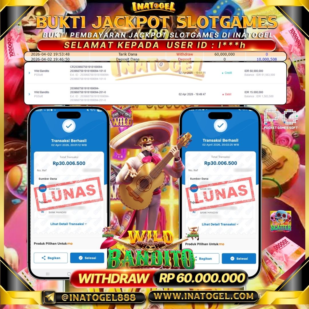 Selamat kepada User Id N***A telah berhasil mendapatkan kemenangan jackpot pada permainan Slot Games Wild Bandito sebesar Rp 65,000,000 Inatogel situs terpercaya sejak dulu hingga saat ini , Untuk kemenangan berapapun pasti akan kami bayarkan . Jangan ragu bermain di Ina Togel . Kami pihak Inatogel Menyampaikan terima kasih kepada seluruh member Ina Togel yang telah Percaya dan setia Bersama kami bermain di Inatogel saat ini.
