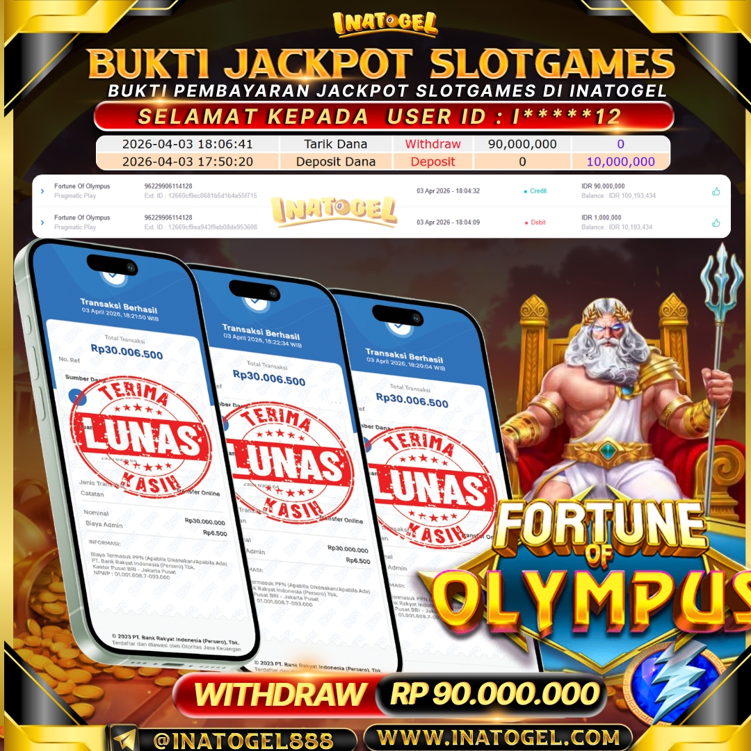 Selamat kepada User Id I****11 telah berhasil mendapatkan kemenangan jackpot pada permainan Slot Games Fortune Of Olympus sebesar Rp 70,000,000 Inatogel situs terpercaya sejak dulu hingga saat ini , Untuk kemenangan berapapun pasti akan kami bayarkan . Jangan ragu bermain di Ina Togel . Kami pihak Inatogel Menyampaikan terima kasih kepada seluruh member Ina Togel yang telah Percaya dan setia Bersama kami bermain di Inatogel saat ini.