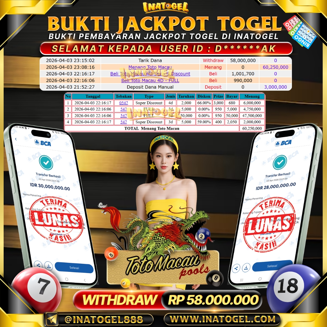Selamat kepada User Id K******99 telah berhasil mendapatkan kemenangan jackpot pada permainan Pool Cambodia Indonesia Inatogel sebesar Rp 60,000,000,- Inatogel situs terpercaya sejak dulu hingga saat ini , Untuk kemenangan berapapun pasti akan kami bayarkan . Jangan ragu bermain di Ina Togel . Kami pihak Inatogel Menyampaikan terima kasih kepada seluruh member Ina Togel yang telah Percaya dan setia Bersama kami bermain di Inatogel hingga saat ini.