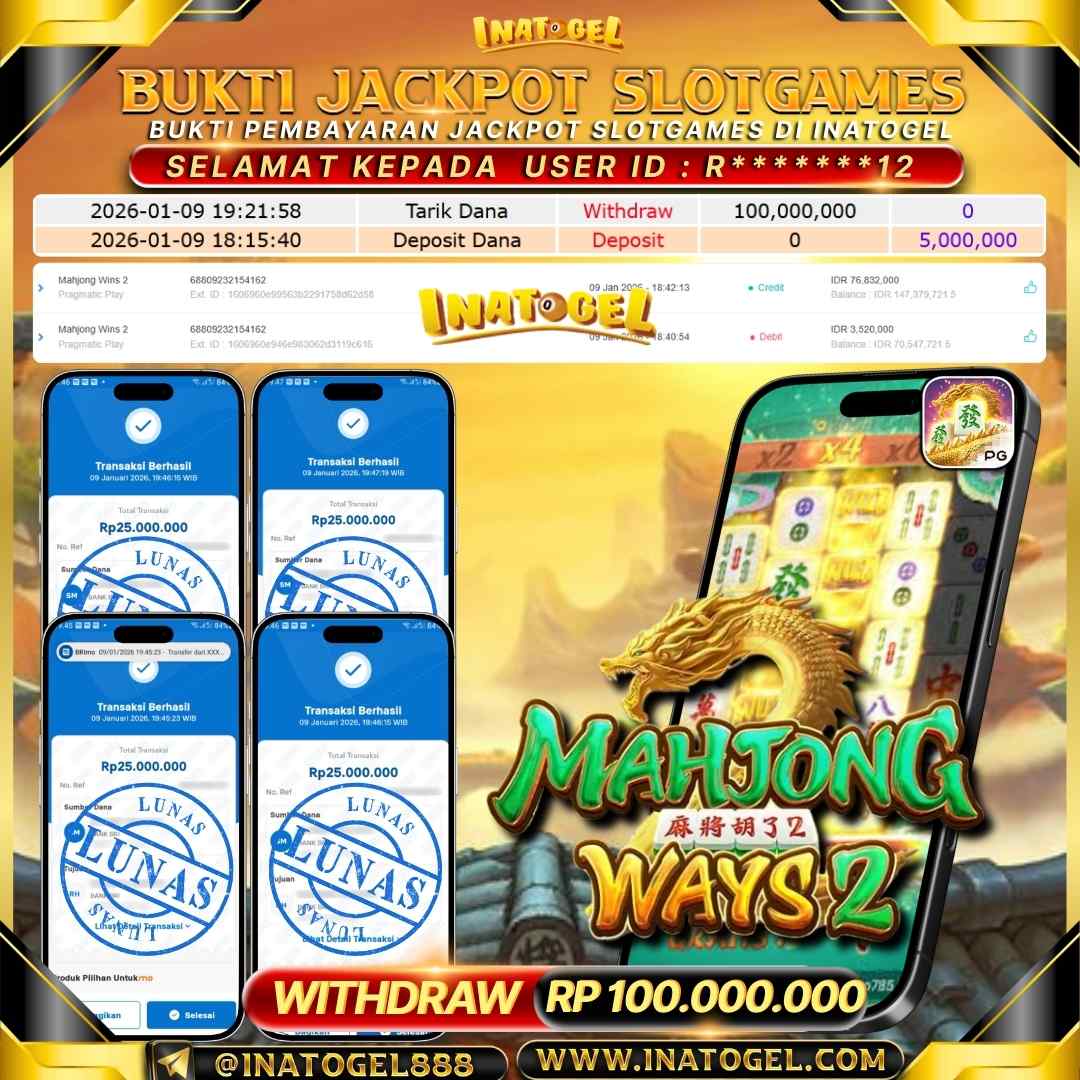 Selamat kepada User Id R*******12 telah berhasil mendapatkan kemenangan jackpot pada permainan SlotGames Mahjong Ways 2 sebesar Rp100,000,000,- . Inatogel situs terpercaya sejak dulu hingga saat ini , Untuk kemenangan berapapun pasti akan kami bayarkan . Jangan ragu bermain di Ina Togel . Kami pihak Inatogel Menyampaikan terima kasih kepada seluruh member Ina Togel yang telah Percaya dan setia Bersama kami bermain di Inatogel saat ini.