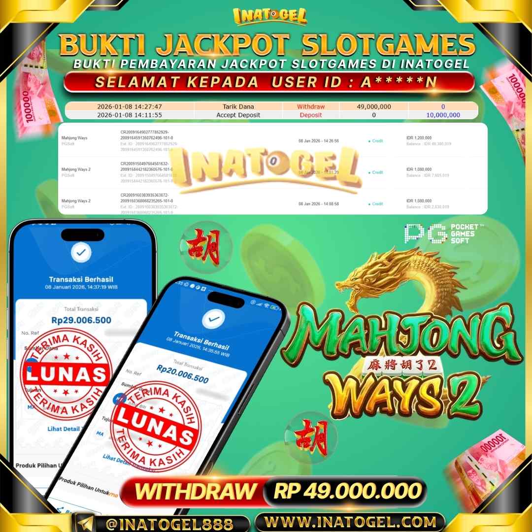 Selamat kepada User Id A*****N telah berhasil mendapatkan kemenangan jackpot pada permainan SlotGames Mahjong Ways 2 sebesar Rp49,000,000,- . Inatogel situs terpercaya sejak dulu hingga saat ini , Untuk kemenangan berapapun pasti akan kami bayarkan . Jangan ragu bermain di Ina Togel . Kami pihak Inatogel Menyampaikan terima kasih kepada seluruh member Ina Togel yang telah Percaya dan setia Bersama kami bermain di Inatogel saat ini.
