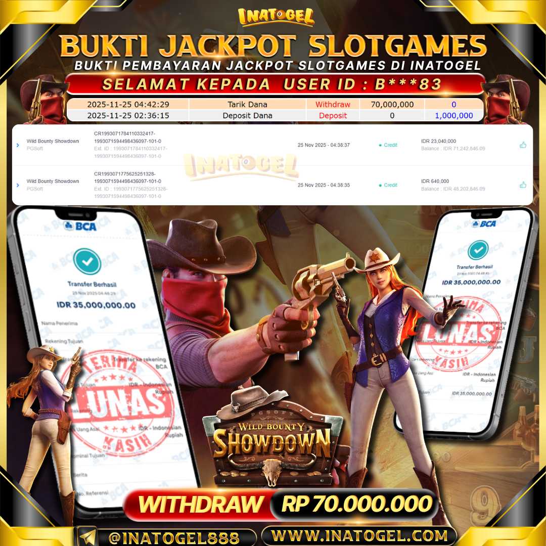 Selamat kepada User Id B***83 telah berhasil mendapatkan kemenangan jackpot pada permainan SlotGame Wild Bounty Showdown sebesar Rp70,000,000,- . Inatogel situs terpercaya sejak dulu hingga saat ini , Untuk kemenangan berapapun pasti akan kami bayarkan . Jangan ragu bermain di Ina Togel . Kami pihak Inatogel Menyampaikan terima kasih kepada seluruh member Ina Togel yang telah Percaya dan setia Bersama kami bermain di Inatogel saat ini.