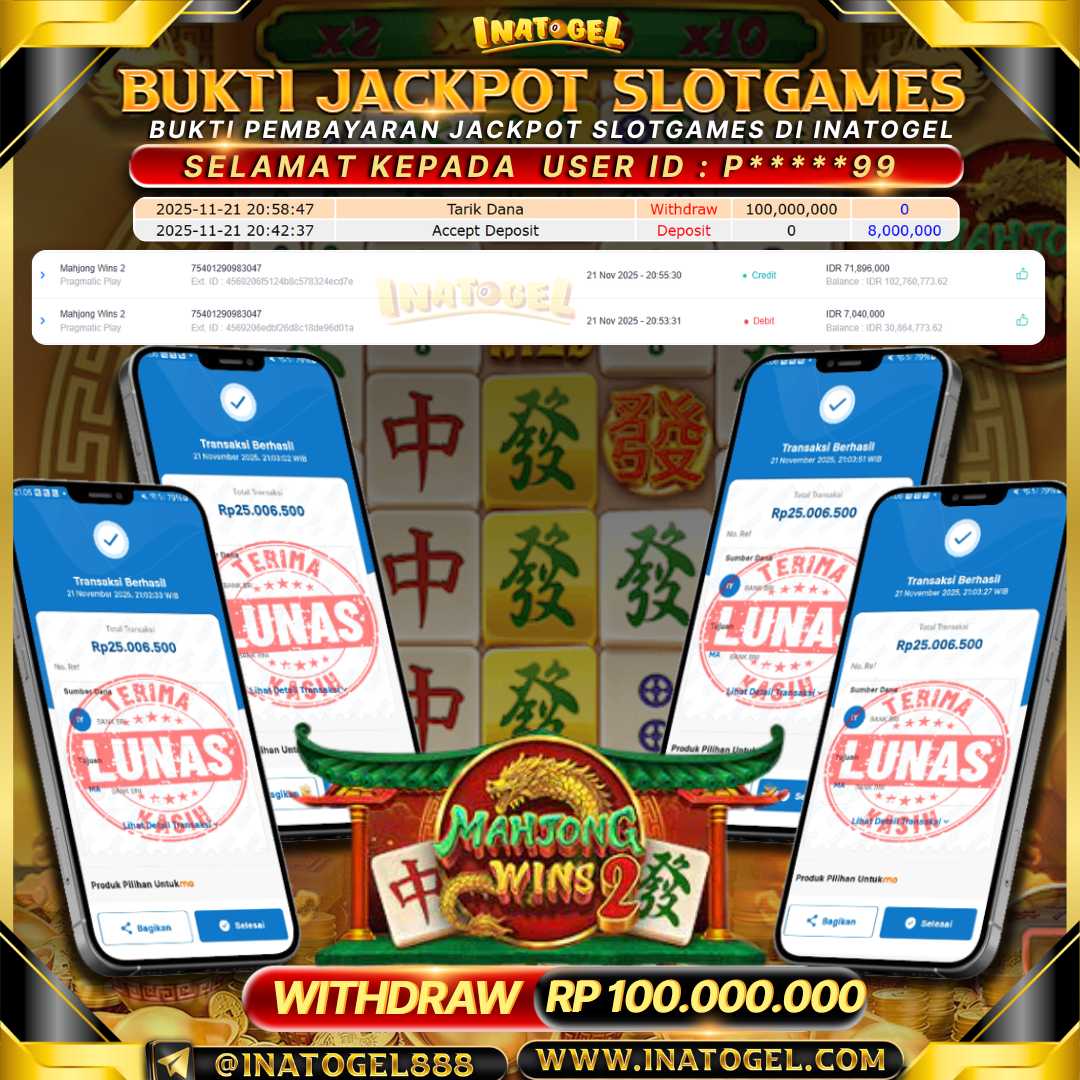 Selamat kepada User Id P*****99 telah berhasil mendapatkan kemenangan jackpot pada permainan SlotGame Mahjong Wins 2 sebesar Rp100,000,000,- . Inatogel situs terpercaya sejak dulu hingga saat ini , Untuk kemenangan berapapun pasti akan kami bayarkan . Jangan ragu bermain di Ina Togel . Kami pihak Inatogel Menyampaikan terima kasih kepada seluruh member Ina Togel yang telah Percaya dan setia Bersama kami bermain di Inatogel saat ini.