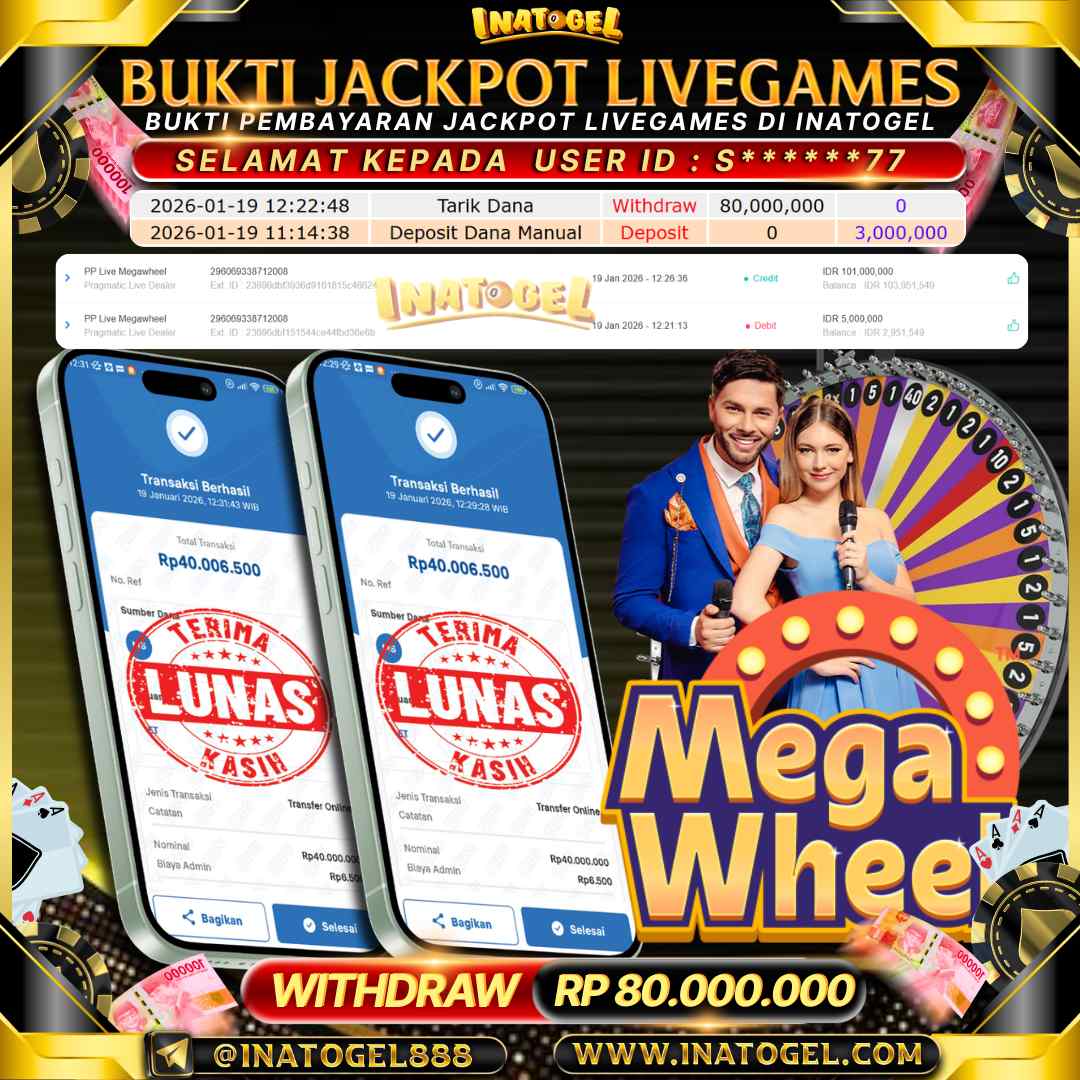 Selamat kepada User Id S******77 telah berhasil mendapatkan kemenangan jackpot pada permainan Live Games Mega Wheel sebesar Rp80,000,000,- . Inatogel situs terpercaya sejak dulu hingga saat ini , Untuk kemenangan berapapun pasti akan kami bayarkan . Jangan ragu bermain di Ina Togel . Kami pihak Inatogel Menyampaikan terima kasih kepada seluruh member Ina Togel yang telah Percaya dan setia Bersama kami bermain di Inatogel saat ini.