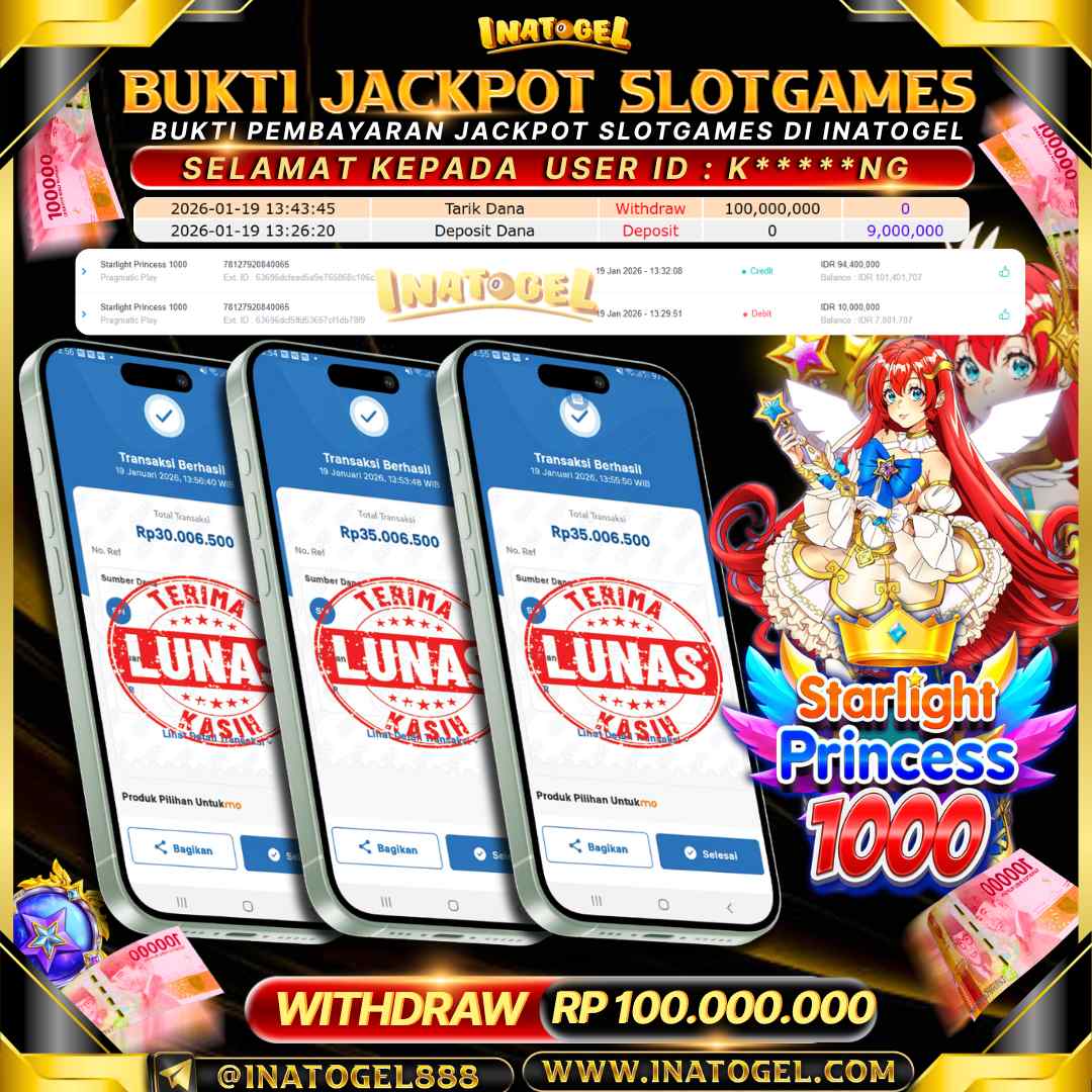 Selamat kepada User Id K*****NG telah berhasil mendapatkan kemenangan jackpot pada permainan Slot Games Starlight Princess 1000 sebesar Rp100,000,000,- . Inatogel situs terpercaya sejak dulu hingga saat ini , Untuk kemenangan berapapun pasti akan kami bayarkan . Jangan ragu bermain di Ina Togel . Kami pihak Inatogel Menyampaikan terima kasih kepada seluruh member Ina Togel yang telah Percaya dan setia Bersama kami bermain di Inatogel saat ini.