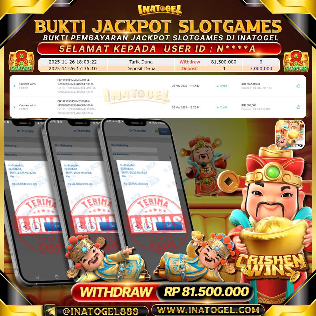 Selamat kepada User Id N***A telah berhasil mendapatkan kemenangan jackpot pada permainan SlotGame Caishen Wins sebesar Rp81,500,000,- . Inatogel situs terpercaya sejak dulu hingga saat ini , Untuk kemenangan berapapun pasti akan kami bayarkan . Jangan ragu bermain di Ina Togel . Kami pihak Inatogel Menyampaikan terima kasih kepada seluruh member Ina Togel yang telah Percaya dan setia Bersama kami bermain di Inatogel saat ini