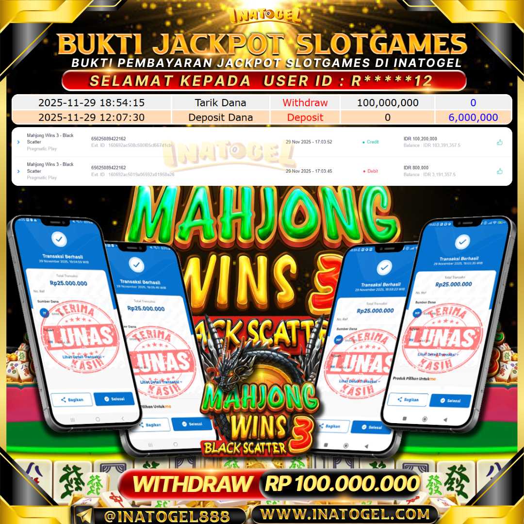 Selamat kepada User Id R*****12 telah berhasil mendapatkan kemenangan jackpot pada permainan SlotGame Mahjong Wins 3 - Black Scatter sebesar Rp100,000,000,- . Inatogel situs terpercaya sejak dulu hingga saat ini , Untuk kemenangan berapapun pasti akan kami bayarkan . Jangan ragu bermain di Ina Togel . Kami pihak Inatogel Menyampaikan terima kasih kepada seluruh member Ina Togel yang telah Percaya dan setia Bersama kami bermain di Inatogel saat ini