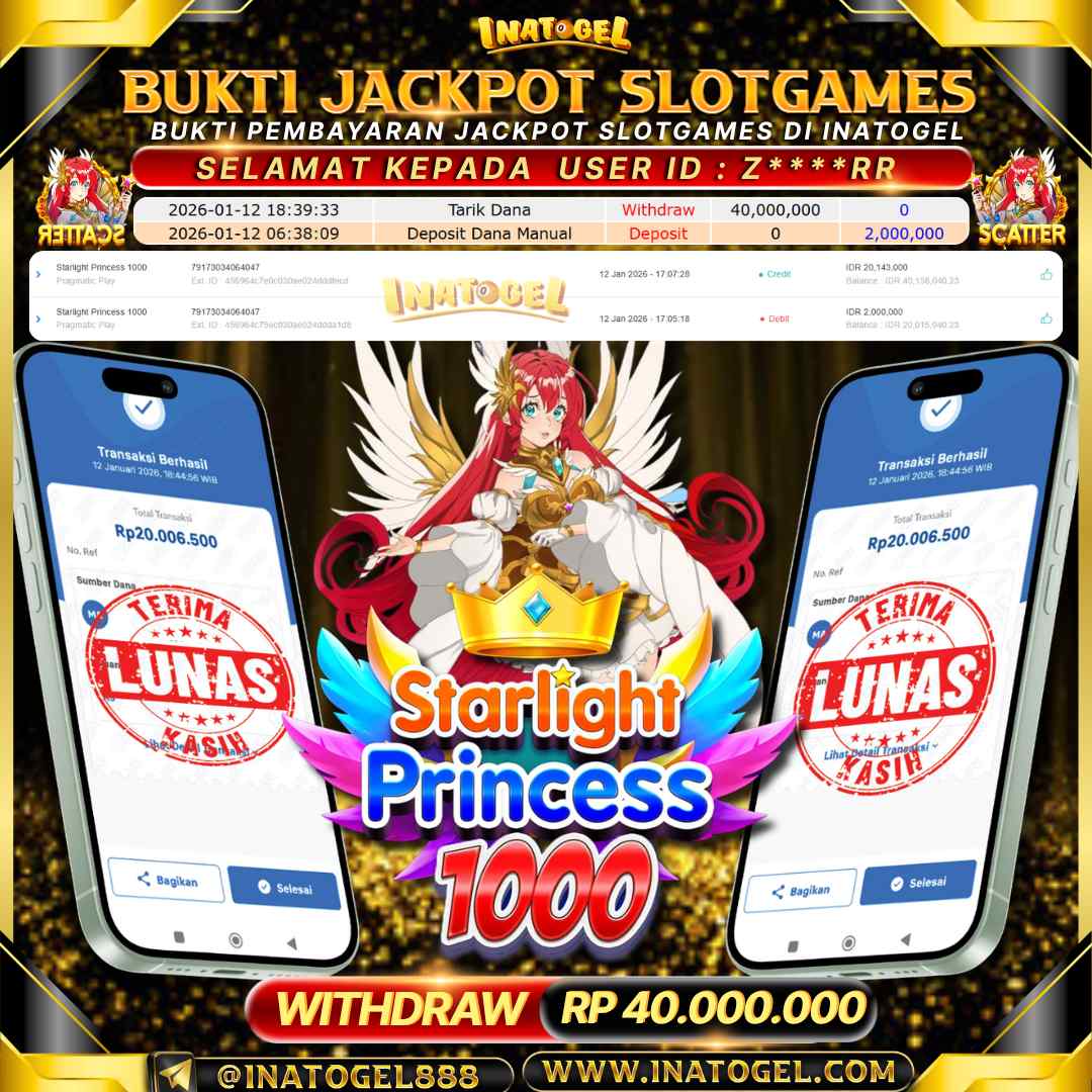Selamat kepada User Id Z****RR telah berhasil mendapatkan kemenangan jackpot pada permainan Slot Games Starlight Princess 1000 sebesar Rp40,000,000,- . Inatogel situs terpercaya sejak dulu hingga saat ini , Untuk kemenangan berapapun pasti akan kami bayarkan . Jangan ragu bermain di Ina Togel . Kami pihak Inatogel Menyampaikan terima kasih kepada seluruh member Ina Togel yang telah Percaya dan setia Bersama kami bermain di Inatogel saat ini.