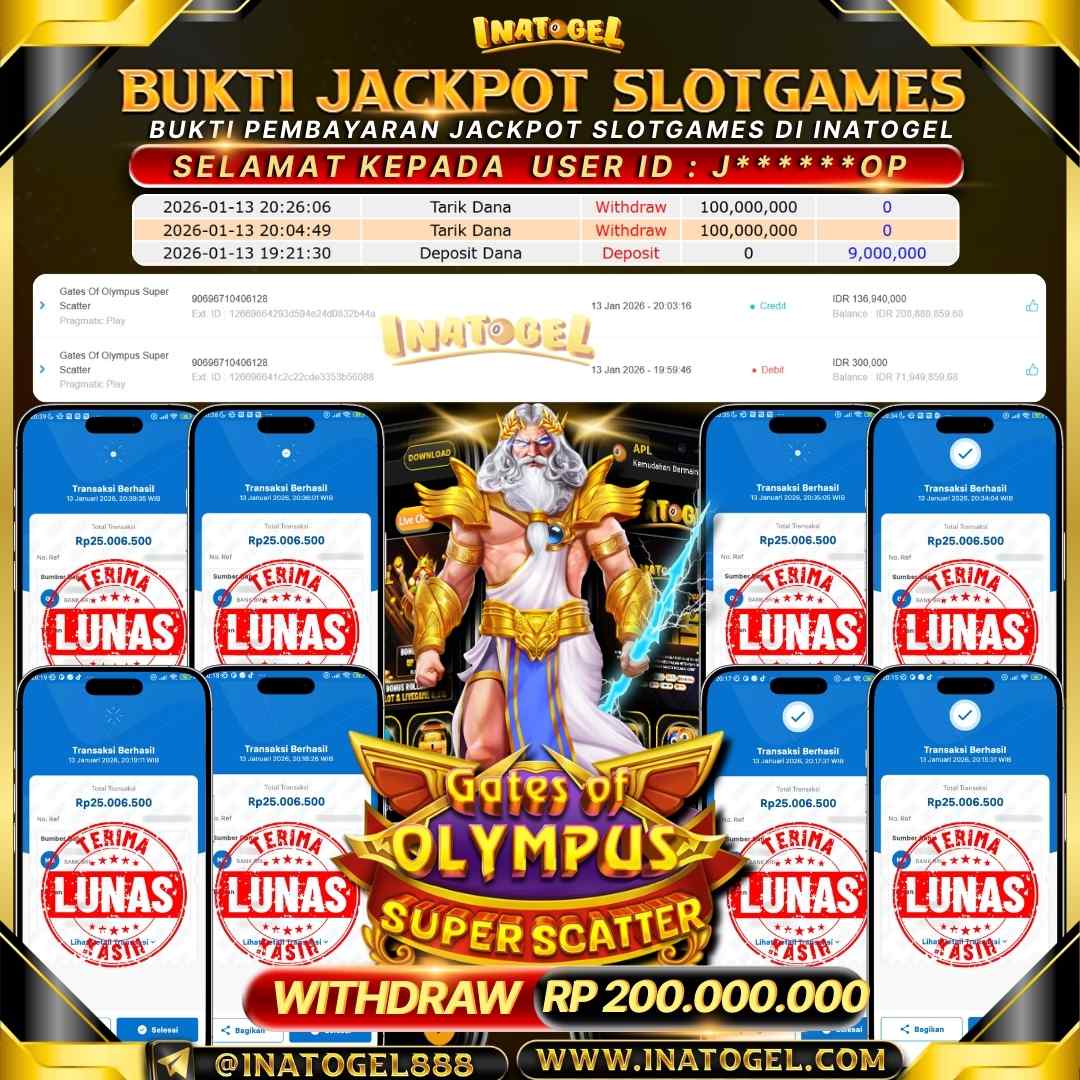 Selamat kepada User Id J*******OP telah berhasil mendapatkan kemenangan jackpot pada permainan Slot Game Gates Of Olympus Super Scatter sebesar Rp200,000,000,- . Inatogel situs terpercaya sejak dulu hingga saat ini , Untuk kemenangan berapapun pasti akan kami bayarkan . Jangan ragu bermain di Ina Togel . Kami pihak Inatogel Menyampaikan terima kasih kepada seluruh member Ina Togel yang telah Percaya dan setia Bersama kami bermain di Inatogel saat ini