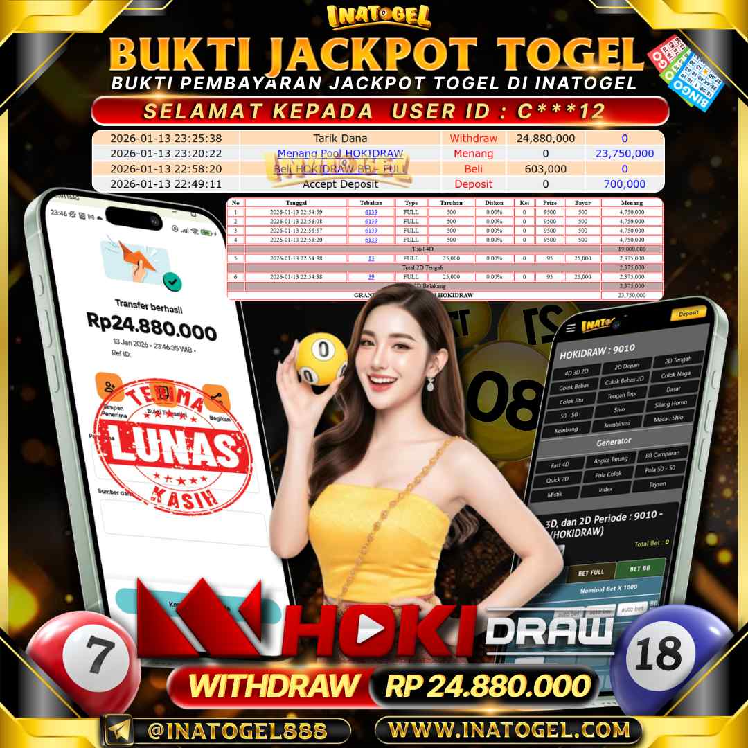 Selamat kepada User Id C***12 telah berhasil mendapatkan kemenangan jackpot pada permainan Togel HOKIDRAW sebesar Rp24.880.000,- . Inatogel situs terpercaya sejak dulu hingga saat ini , Untuk kemenangan berapapun pasti akan kami bayarkan . Jangan ragu bermain di Ina Togel . Kami pihak Inatogel Menyampaikan terima kasih kepada seluruh member Ina Togel yang telah Percaya dan setia Bersama kami bermain di Inatogel hingga saat ini.
