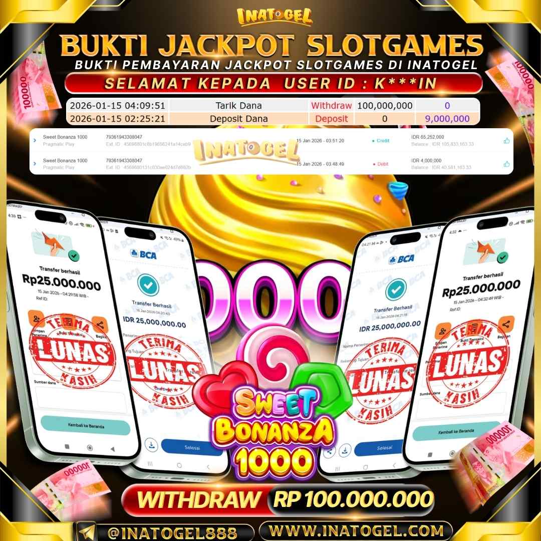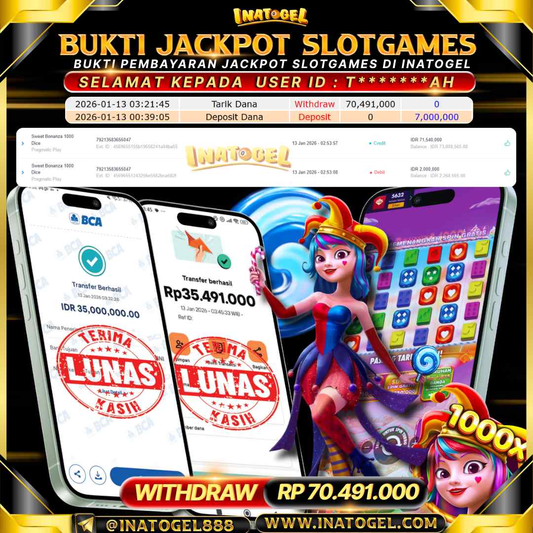 Selamat kepada User Id T*******AH telah berhasil mendapatkan kemenangan jackpot pada permainan Slot Game Sweet Bonanza 1000 Dice sebesar Rp70.491.000,- . Inatogel situs terpercaya sejak dulu hingga saat ini , Untuk kemenangan berapapun pasti akan kami bayarkan . Jangan ragu bermain di Ina Togel . Kami pihak Inatogel Menyampaikan terima kasih kepada seluruh member Ina Togel yang telah Percaya dan setia Bersama kami bermain di Inatogel saat ini.