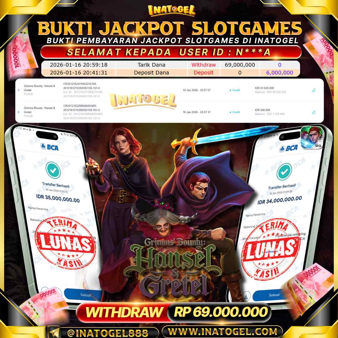 Selamat kepada User Id N***A telah berhasil mendapatkan kemenangan jackpot pada permainan Slot Game Grimms Bounty: Hansel & Gretel sebesar Rp69,000,000,- . Inatogel situs terpercaya sejak dulu hingga saat ini , Untuk kemenangan berapapun pasti akan kami bayarkan . Jangan ragu bermain di Ina Togel . Kami pihak Inatogel Menyampaikan terima kasih kepada seluruh member Ina Togel yang telah Percaya dan setia Bersama kami bermain di Inatogel saat ini.