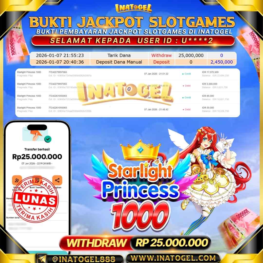 Selamat kepada User Id U****2 telah berhasil mendapatkan kemenangan jackpot pada permainan SlotGames Starlight Princess 1000 sebesar Rp25,000,000,- . Inatogel situs terpercaya sejak dulu hingga saat ini , Untuk kemenangan berapapun pasti akan kami bayarkan . Jangan ragu bermain di Ina Togel . Kami pihak Inatogel Menyampaikan terima kasih kepada seluruh member Ina Togel yang telah Percaya dan setia Bersama kami bermain di Inatogel saat ini.