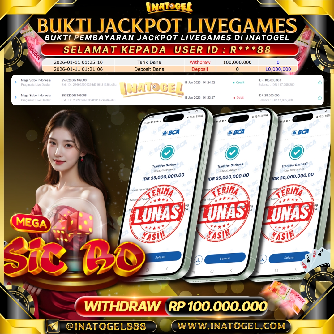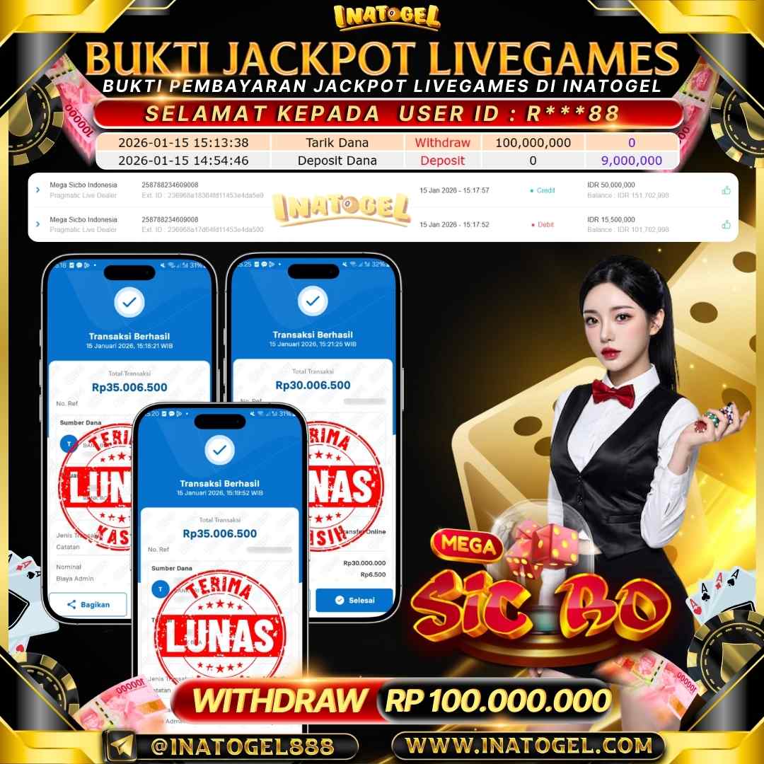 Selamat kepada User Id R***88 telah berhasil mendapatkan kemenangan jackpot pada permainan LiveGames Mega Sicbo Indonesia sebesar Rp100,000,000,- . Inatogel situs terpercaya sejak dulu hingga saat ini , Untuk kemenangan berapapun pasti akan kami bayarkan . Jangan ragu bermain di Ina Togel . Kami pihak Inatogel Menyampaikan terima kasih kepada seluruh member Ina Togel yang telah Percaya dan setia Bersama kami bermain di Inatogel saat ini.