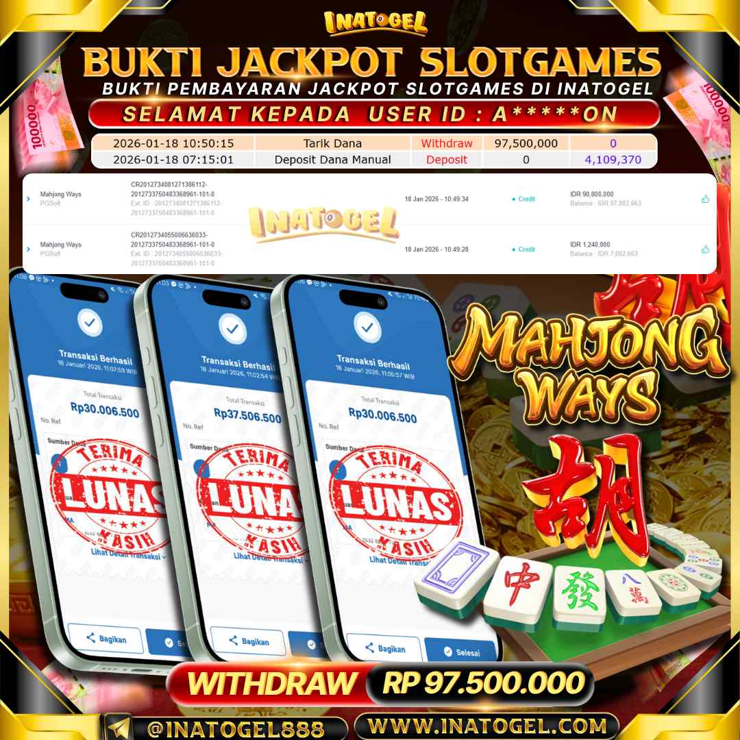 Selamat kepada User Id A*****ON telah berhasil mendapatkan kemenangan jackpot pada permainan SlotGames Mahjong Ways sebesar Rp97,500,000,- . Inatogel situs terpercaya sejak dulu hingga saat ini , Untuk kemenangan berapapun pasti akan kami bayarkan . Jangan ragu bermain di Ina Togel . Kami pihak Inatogel Menyampaikan terima kasih kepada seluruh member Ina Togel yang telah Percaya dan setia Bersama kami bermain di Inatogel saat ini.