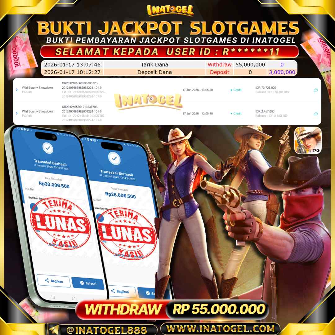 Selamat kepada User Id R******11 telah berhasil mendapatkan kemenangan jackpot pada permainan Slot Games Wild Bounty Showdown sebesar Rp55,000,000,- . Inatogel situs terpercaya sejak dulu hingga saat ini , Untuk kemenangan berapapun pasti akan kami bayarkan . Jangan ragu bermain di Ina Togel . Kami pihak Inatogel Menyampaikan terima kasih kepada seluruh member Ina Togel yang telah Percaya dan setia Bersama kami bermain di Inatogel saat ini.