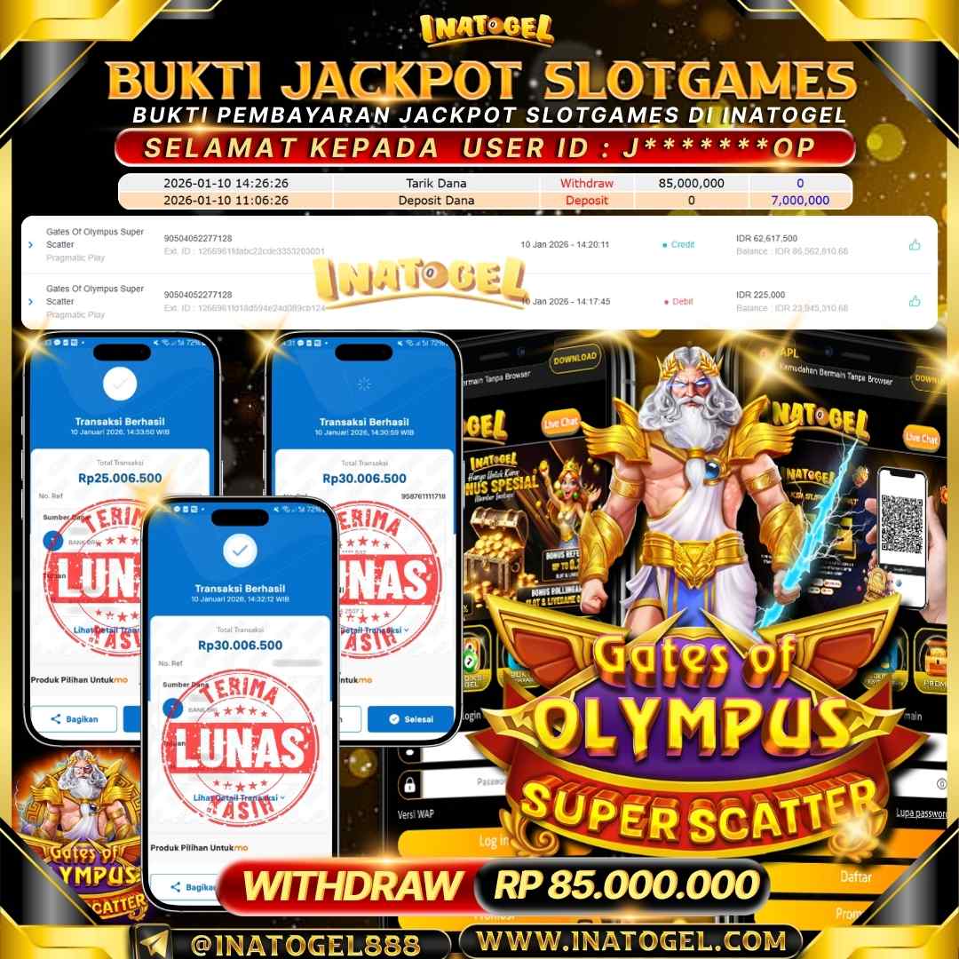 Selamat kepada User Id J*******OP telah berhasil mendapatkan kemenangan jackpot pada permainan SlotGame Gates Of Olympus Super Scatter sebesar Rp85,000,000,- . Inatogel situs terpercaya sejak dulu hingga saat ini , Untuk kemenangan berapapun pasti akan kami bayarkan . Jangan ragu bermain di Ina Togel . Kami pihak Inatogel Menyampaikan terima kasih kepada seluruh member Ina Togel yang telah Percaya dan setia Bersama kami bermain di Inatogel saat ini.