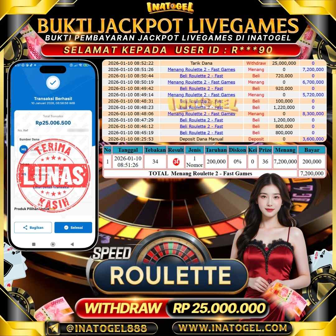Selamat kepada UserId R***90 telah berhasil mendapatkan kemenangan jackpot pada permainan LiveGame Roulette Inatogel sebesar Rp25,000,000,- Inatogel situs terpercaya sejak dulu hingga saat ini , Untuk kemenangan berapapun pasti akan kami bayarkan . Jangan ragu bermain di Ina Togel . Kami pihak Inatogel Menyampaikan terima kasih kepada seluruh member Ina Togel yang telah Percaya dan setia Bersama kami bermain di Inatogel hingga saat ini.