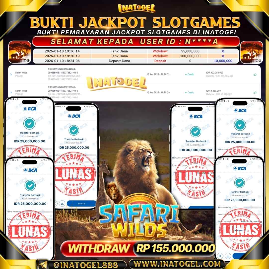 Selamat kepada UserId N****A telah berhasil mendapatkan kemenangan jackpot pada permainan SlotGame Safari Wilds Inatogel sebesar Rp155,000,000,- . Inatogel situs terpercaya sejak dulu hingga saat ini , Untuk kemenangan berapapun pasti akan kami bayarkan . Jangan ragu bermain di Ina Togel . Kami pihak Inatogel Menyampaikan terima kasih kepada seluruh member Ina Togel yang telah Percaya dan setia Bersama kami bermain di Inatogel hingga saat ini.
