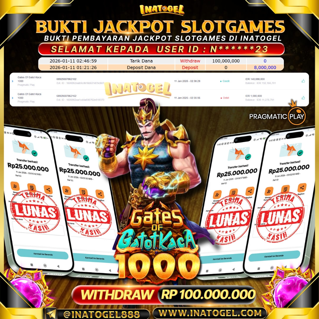 Selamat kepada UserId N******23 telah berhasil mendapatkan kemenangan jackpot pada permainan Slot Game Gates Of Gatot Kaca 1000 Inatogel sebesar Rp100,000,000,- . Inatogel situs terpercaya sejak dulu hingga saat ini , Untuk kemenangan berapapun pasti akan kami bayarkan . Jangan ragu bermain di Ina Togel . Kami pihak Inatogel Menyampaikan terima kasih kepada seluruh member Ina Togel yang telah Percaya dan setia Bersama kami bermain di Inatogel hingga saat ini.