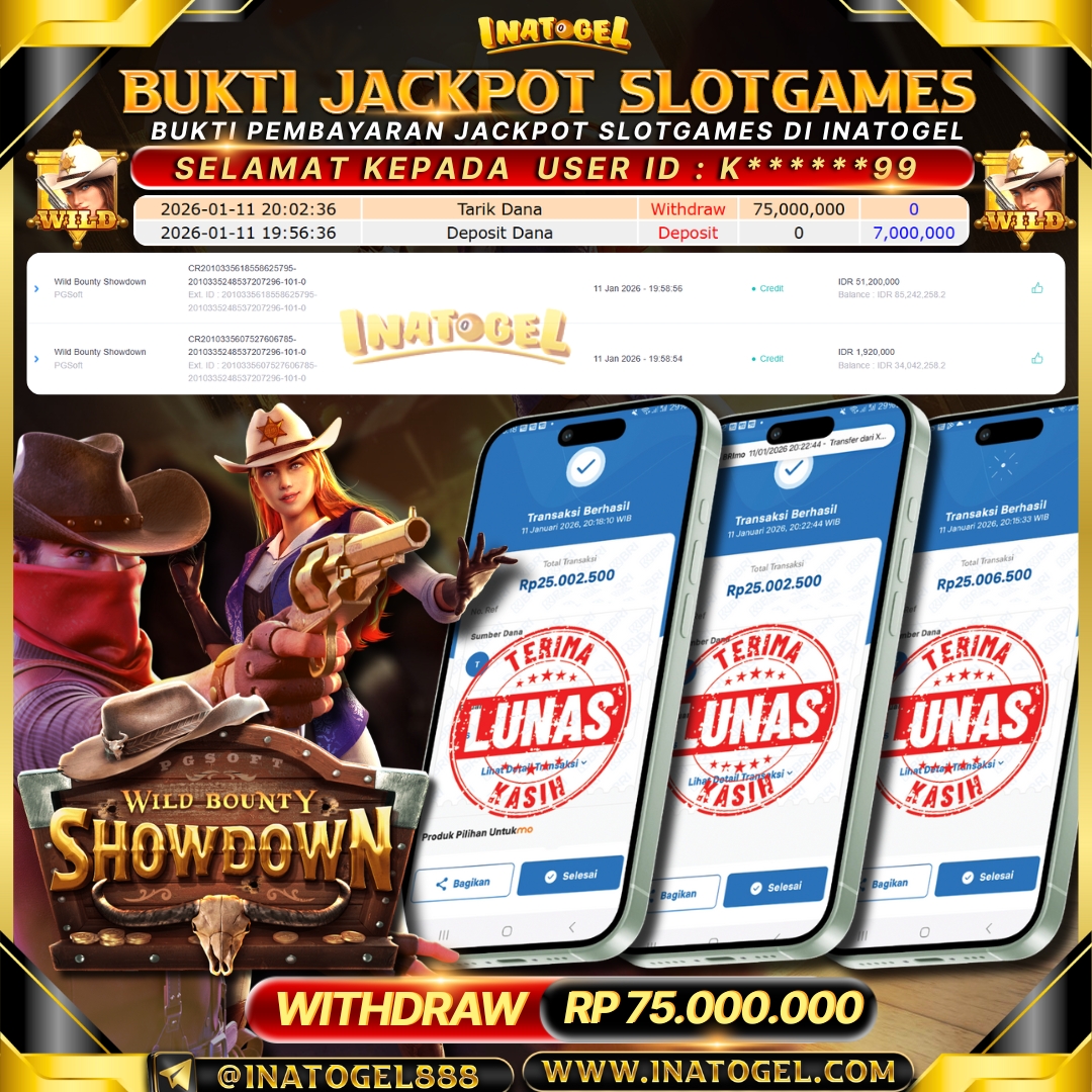 Selamat kepada User Id K******99 telah berhasil mendapatkan kemenangan jackpot pada permainan SlotGames Wild Bounty Showdown sebesar Rp75,000,000,- . Inatogel situs terpercaya sejak dulu hingga saat ini , Untuk kemenangan berapapun pasti akan kami bayarkan . Jangan ragu bermain di Ina Togel . Kami pihak Inatogel Menyampaikan terima kasih kepada seluruh member Ina Togel yang telah Percaya dan setia Bersama kami bermain di Inatogel saat ini.