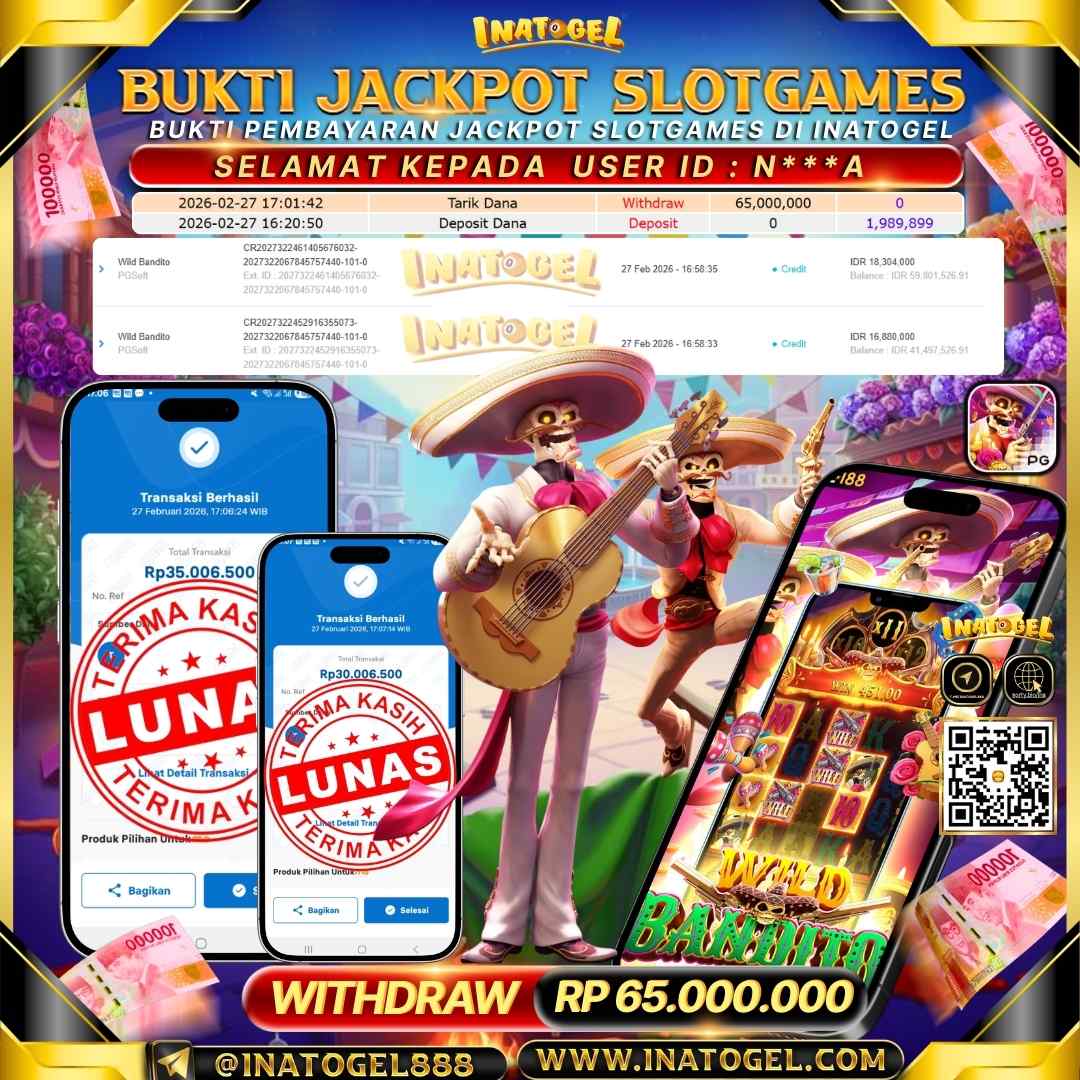 Selamat kepada User Id N***A telah berhasil mendapatkan kemenangan jackpot pada permainan Slot Games Wild Bandito sebesar Rp 65,000,000 Inatogel situs terpercaya sejak dulu hingga saat ini , Untuk kemenangan berapapun pasti akan kami bayarkan . Jangan ragu bermain di Ina Togel . Kami pihak Inatogel Menyampaikan terima kasih kepada seluruh member Ina Togel yang telah Percaya dan setia Bersama kami bermain di Inatogel saat ini.