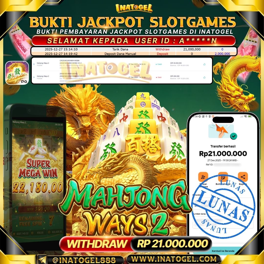 Selamat kepada User Id G*****13 telah berhasil mendapatkan kemenangan jackpot pada permainan SlotGames Mahjong Ways sebesar Rp34,000,000,- . Inatogel situs terpercaya sejak dulu hingga saat ini , Untuk kemenangan berapapun pasti akan kami bayarkan . Jangan ragu bermain di Ina Togel . Kami pihak Inatogel Menyampaikan terima kasih kepada seluruh member Ina Togel yang telah Percaya dan setia Bersama kami bermain di Inatogel saat ini.