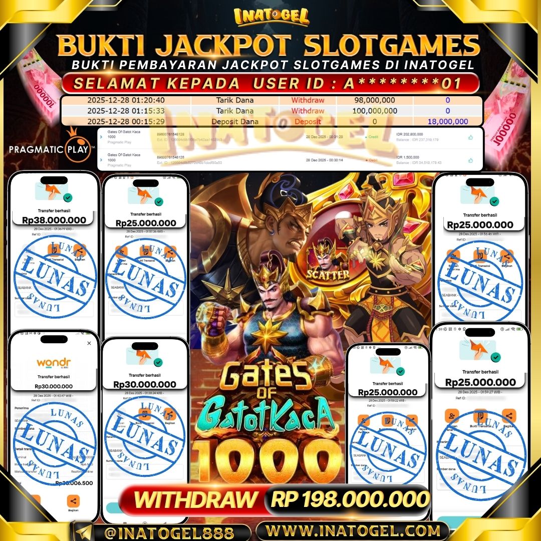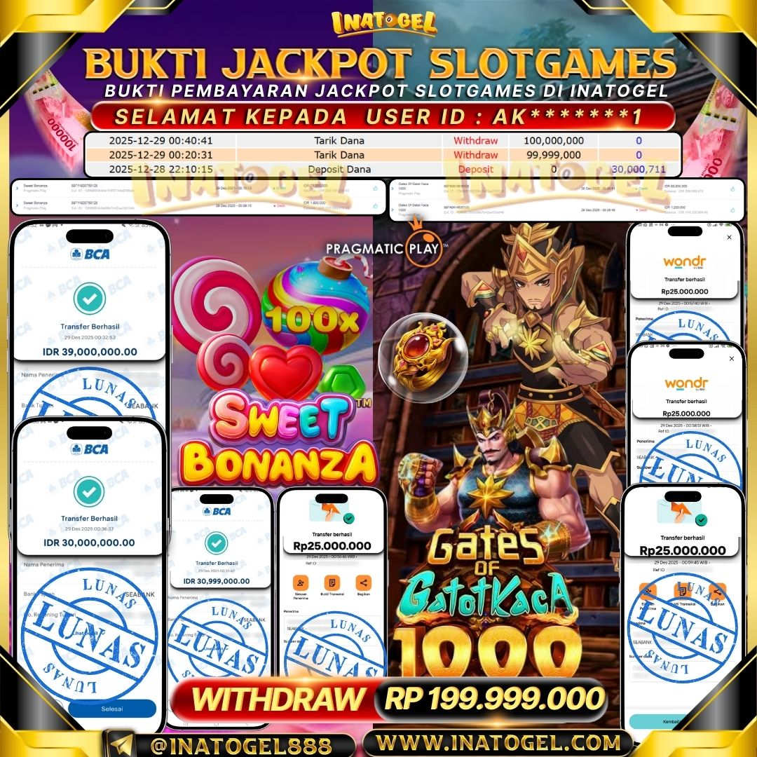 Selamat kepada User Id AK*******1 telah berhasil mendapatkan kemenangan jackpot pada permainan SlotGames Sweet Bonanza & Gates Of Gatotkaca 1000 sebesar Rp199,999,000,- . Inatogel situs terpercaya sejak dulu hingga saat ini , Untuk kemenangan berapapun pasti akan kami bayarkan . Jangan ragu bermain di Ina Togel . Kami pihak Inatogel Menyampaikan terima kasih kepada seluruh member Ina Togel yang telah Percaya dan setia Bersama kami bermain di Inatogel saat ini.