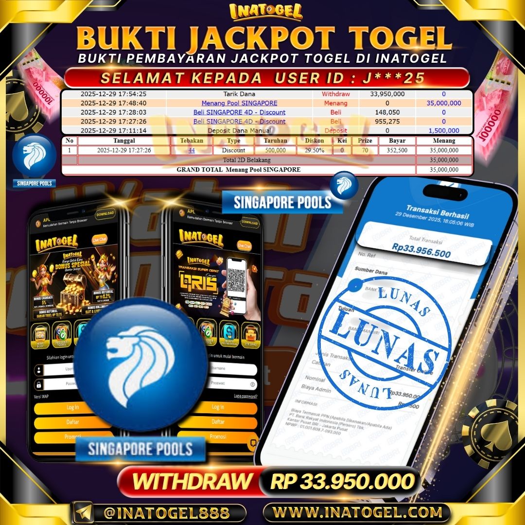 Selamat kepada User Id J***25 telah berhasil mendapatkan kemenangan jackpot pada permainan Togel Singapore Pools sebesar Rp33,950,000,- . Inatogel situs terpercaya sejak dulu hingga saat ini , Untuk kemenangan berapapun pasti akan kami bayarkan . Jangan ragu bermain di Ina Togel . Kami pihak Inatogel Menyampaikan terima kasih kepada seluruh member Ina Togel yang telah Percaya dan setia Bersama kami bermain di Inatogel saat ini.