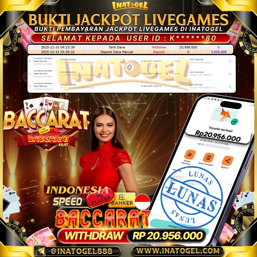 Selamat kepada User Id K******80 telah berhasil mendapatkan kemenangan jackpot pada permainan LiveGames Indonesian Speed Baccarat sebesar Rp20,956,000,- . Inatogel situs terpercaya sejak dulu hingga saat ini , Untuk kemenangan berapapun pasti akan kami bayarkan . Jangan ragu bermain di Ina Togel . Kami pihak Inatogel Menyampaikan terima kasih kepada seluruh member Ina Togel yang telah Percaya dan setia Bersama kami bermain di Inatogel saat ini.