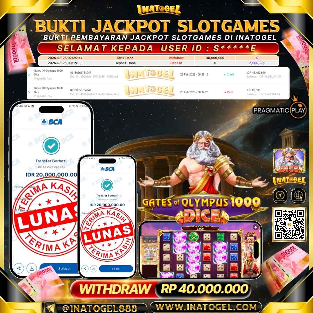 Selamat kepada User Id S*****E telah berhasil mendapatkan kemenangan jackpot pada permainan Slot Games Gates Of Olympus 1000 Dice sebesar Rp 40,000,000 Inatogel situs terpercaya sejak dulu hingga saat ini , Untuk kemenangan berapapun pasti akan kami bayarkan . Jangan ragu bermain di Ina Togel . Kami pihak Inatogel Menyampaikan terima kasih kepada seluruh member Ina Togel yang telah Percaya dan setia Bersama kami bermain di Inatogel saat ini.