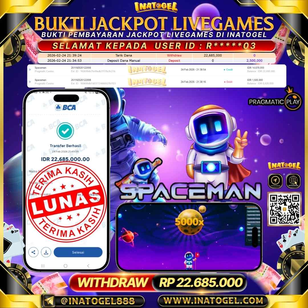 Selamat kepada User Id R*****03 telah berhasil mendapatkan kemenangan jackpot pada permainan Live Game Spaceman Inatogel sebesar Rp 22,685,000,- Inatogel situs terpercaya sejak dulu hingga saat ini , Untuk kemenangan berapapun pasti akan kami bayarkan . Jangan ragu bermain di Ina Togel . Kami pihak Inatogel Menyampaikan terima kasih kepada seluruh member Ina Togel yang telah Percaya dan setia Bersama kami bermain di Inatogel hingga saat ini.