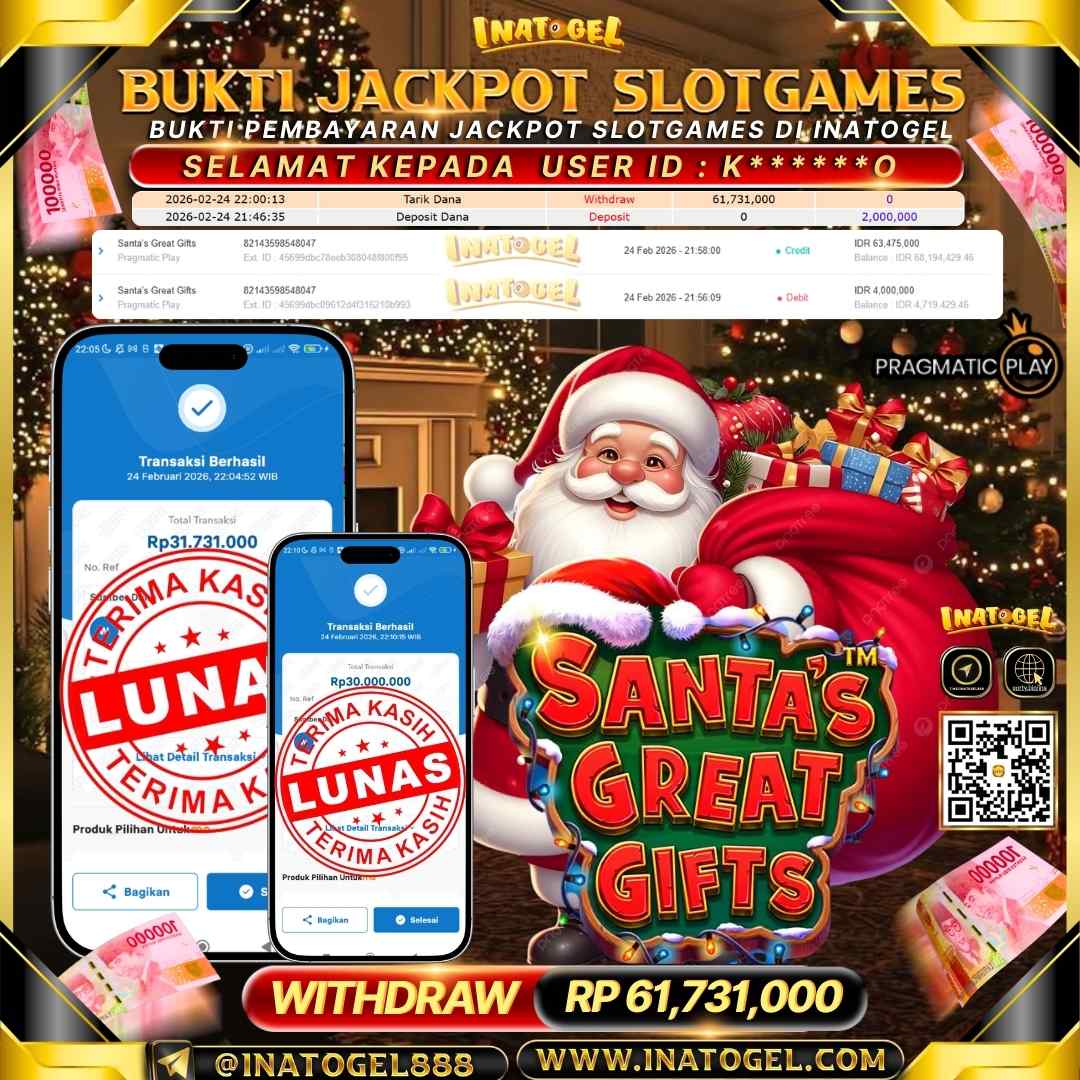Selamat kepada User Id K******O telah berhasil mendapatkan kemenangan jackpot pada permainan Slot Games Santa's Great Gifts sebesar Rp 61,731,000 Inatogel situs terpercaya sejak dulu hingga saat ini , Untuk kemenangan berapapun pasti akan kami bayarkan . Jangan ragu bermain di Ina Togel . Kami pihak Inatogel Menyampaikan terima kasih kepada seluruh member Ina Togel yang telah Percaya dan setia Bersama kami bermain di Inatogel saat ini.
