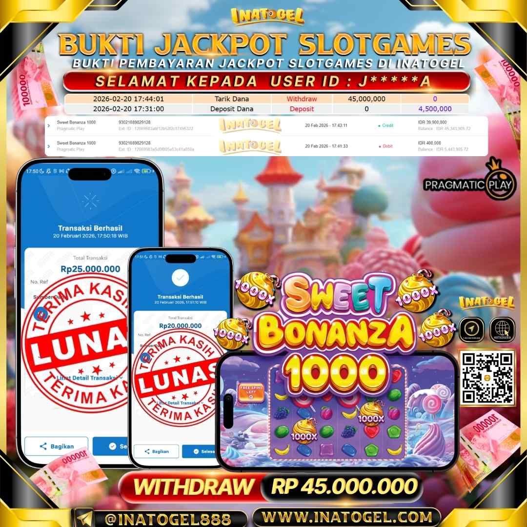 Selamat kepada User Id J*****A telah berhasil mendapatkan kemenangan jackpot pada permainan Slot Games Sweet Bonanza 1000 sebesar Rp 45,000,000- . Inatogel situs terpercaya sejak dulu hingga saat ini , Untuk kemenangan berapapun pasti akan kami bayarkan . Jangan ragu bermain di Ina Togel . Kami pihak Inatogel Menyampaikan terima kasih kepada seluruh member Ina Togel yang telah Percaya dan setia Bersama kami bermain di Inatogel saat ini.