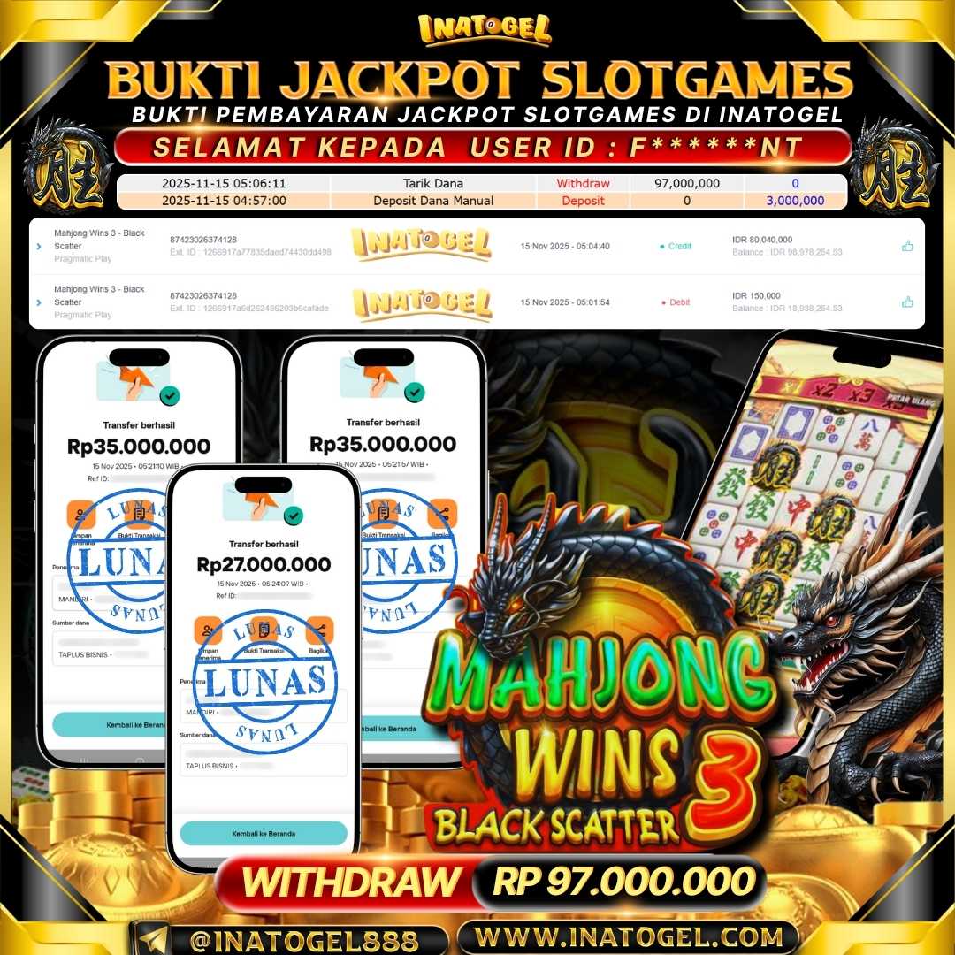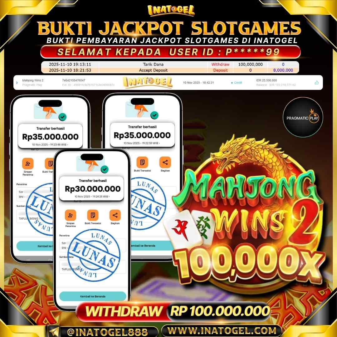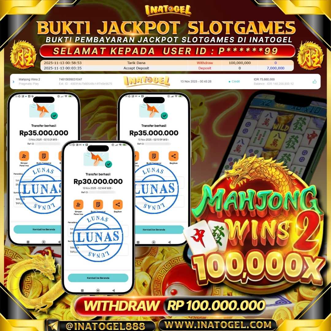 Selamat kepada User Id P*****99 telah berhasil mendapatkan kemenangan jackpot pada permainan SlotGame Mahjong Wins 2 sebesar Rp100,000,000,- . Inatogel situs terpercaya sejak dulu hingga saat ini , Untuk kemenangan berapapun pasti akan kami bayarkan . Jangan ragu bermain di Ina Togel . Kami pihak Inatogel Menyampaikan terima kasih kepada seluruh member Ina Togel yang telah Percaya dan setia Bersama kami bermain di Inatogel saat ini.