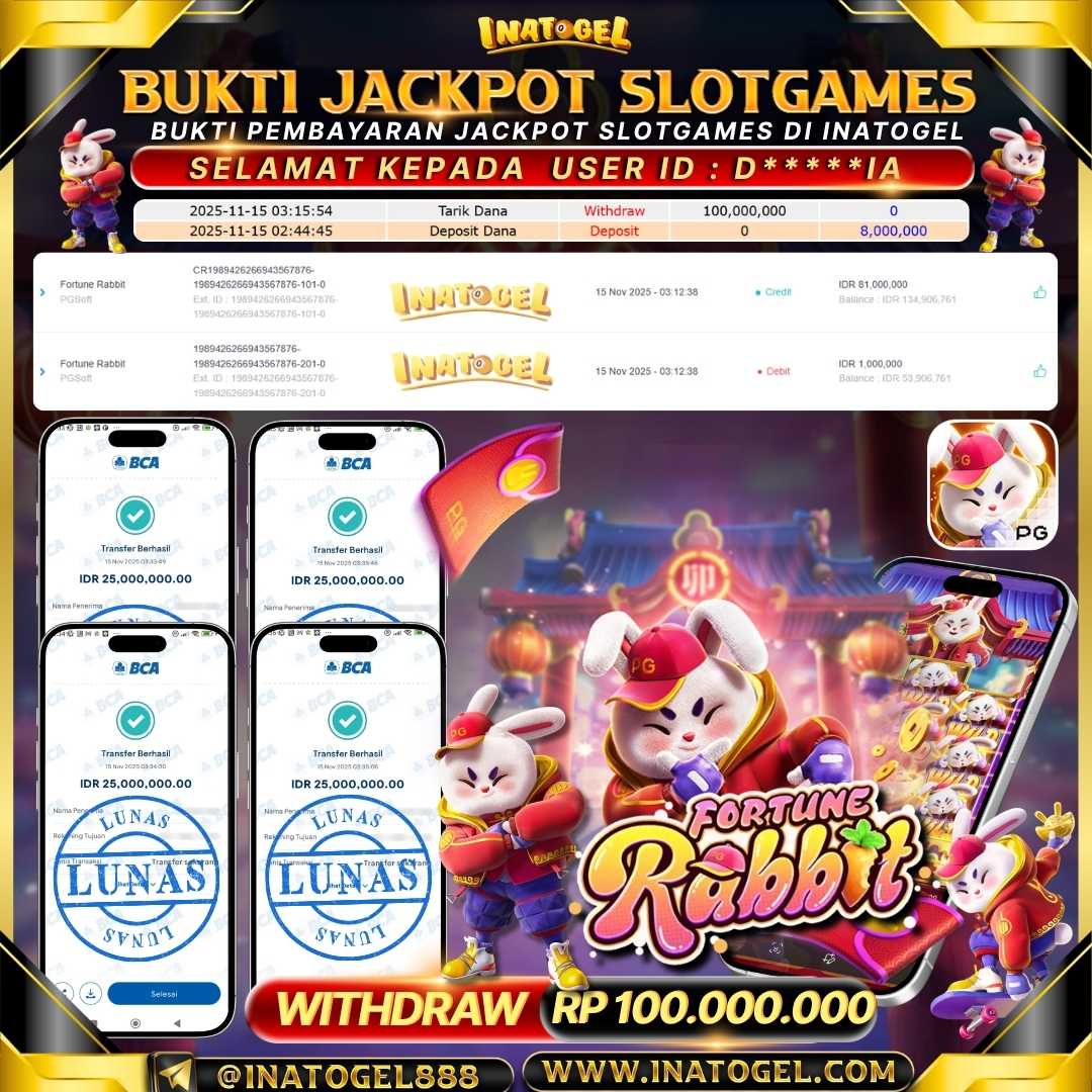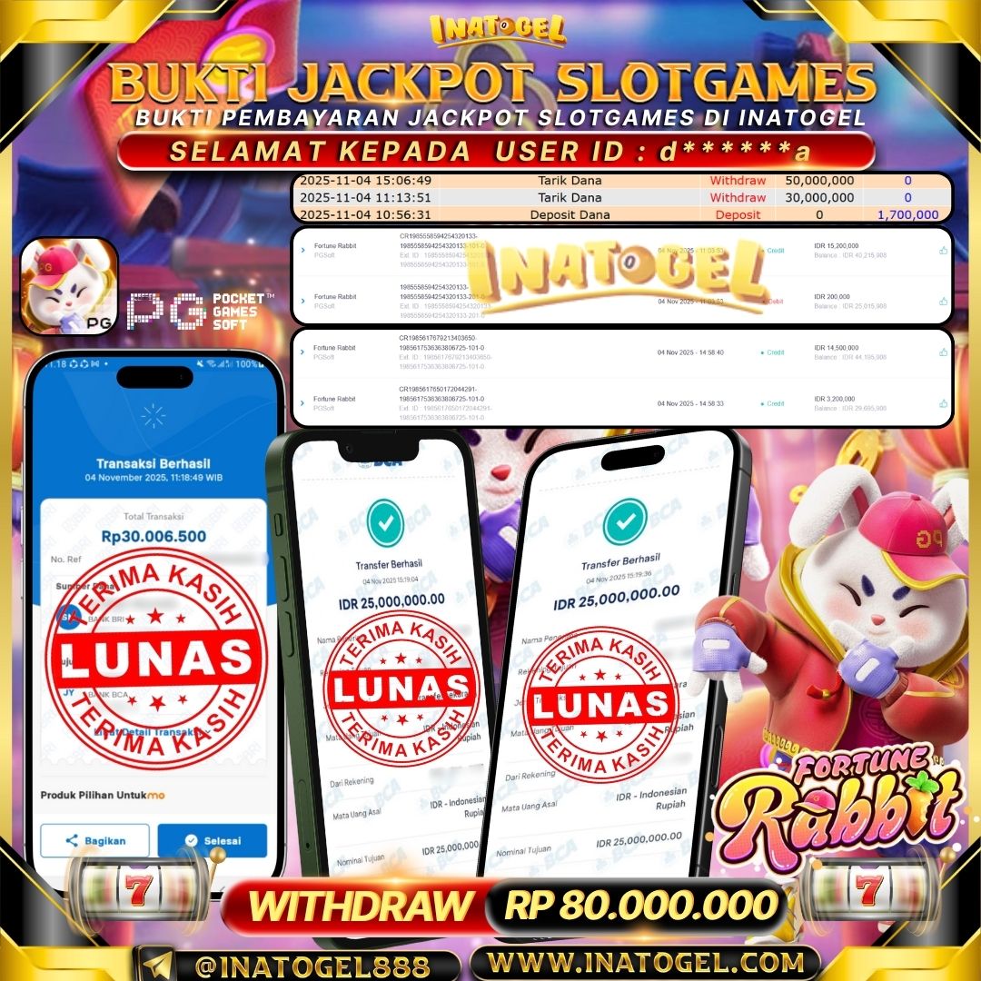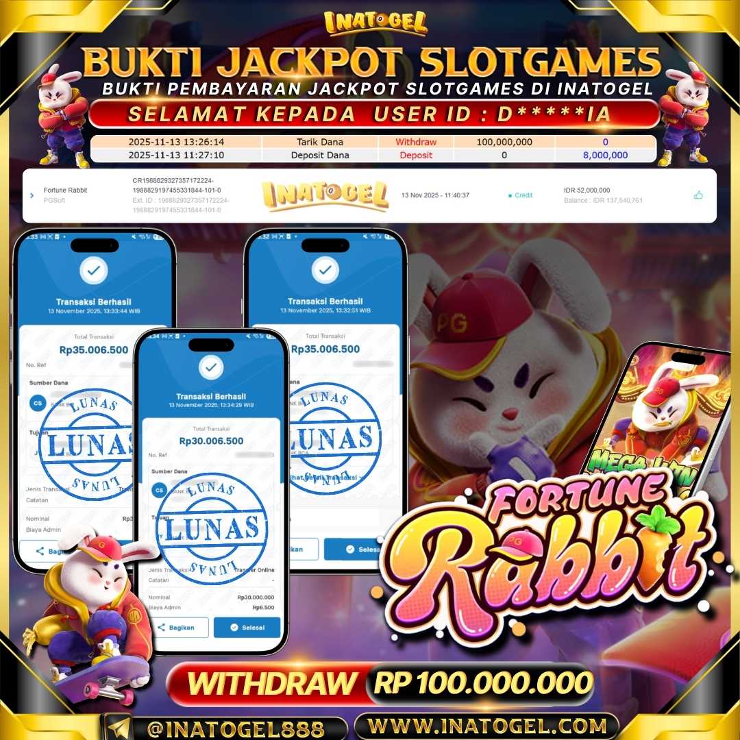 Selamat kepada User Id d*****a telah berhasil mendapatkan kemenangan jackpot pada permainan SlotGame Fortune Rabbit Inatogel sebesar Rp80,000,000,- . Inatogel situs terpercaya sejak dulu hingga saat ini , Untuk kemenangan berapapun pasti akan kami bayarkan . Jangan ragu bermain di Ina Togel . Kami pihak Inatogel Menyampaikan terima kasih kepada seluruh member Ina Togel yang telah Percaya dan setia Bersama kami bermain di Inatogel hingga saat ini.
