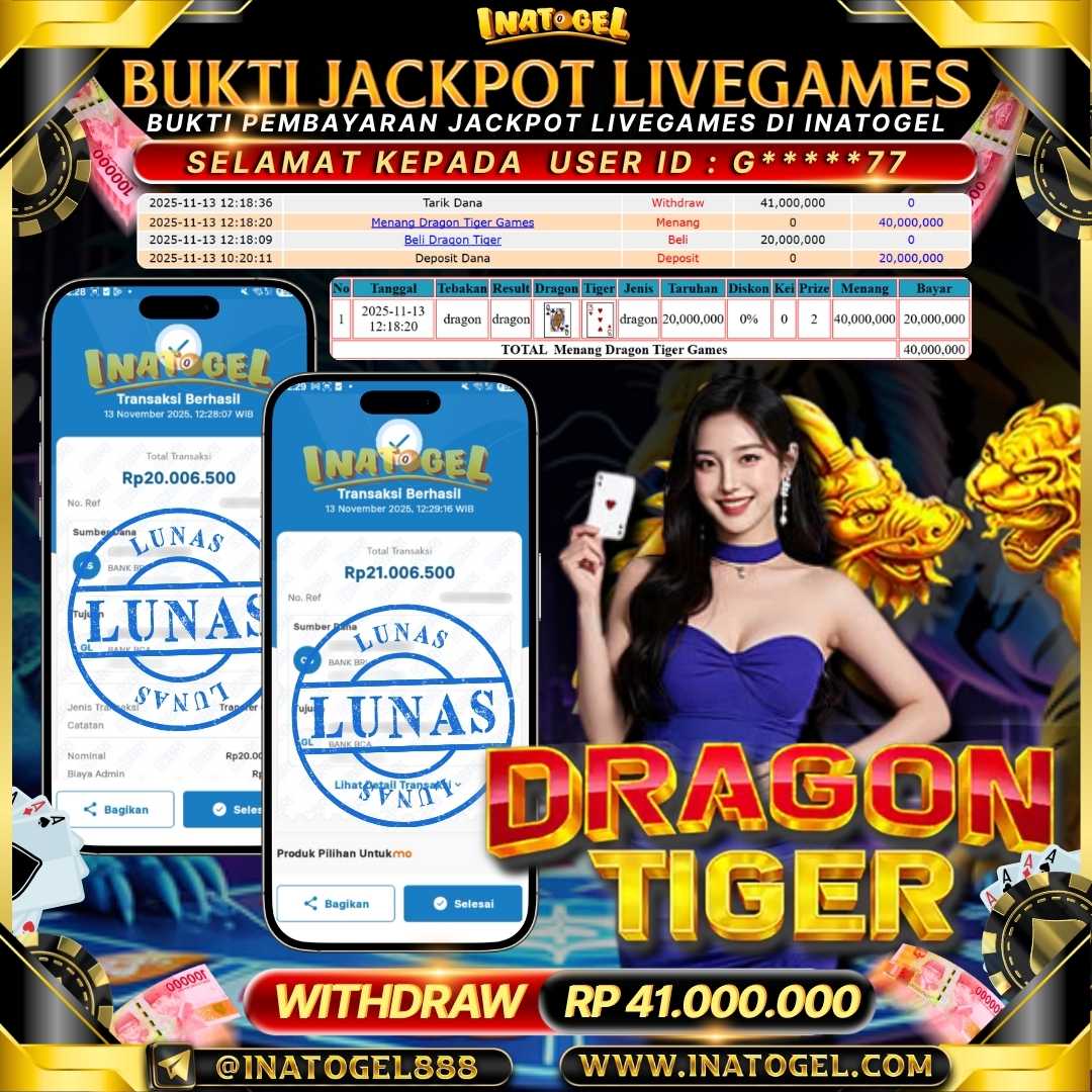 Selamat kepada User Id G*****77 telah berhasil mendapatkan kemenangan jackpot pada permainan Live Games PP Live Dragon Tiger Inatogel sebesar Rp41,000,000,- . Inatogel situs terpercaya sejak dulu hingga saat ini , Untuk kemenangan berapapun pasti akan kami bayarkan . Jangan ragu bermain di Ina Togel . Kami pihak Inatogel Menyampaikan terima kasih kepada seluruh member Ina Togel yang telah Percaya dan setia Bersama kami bermain di Inatogel hingga saat ini.