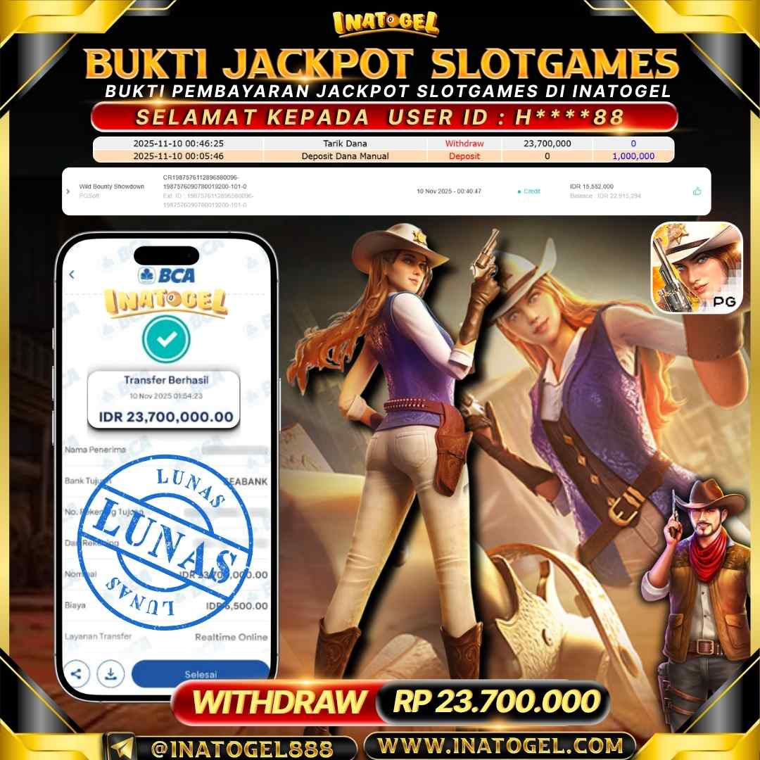 Selamat kepada User Id H****88 telah berhasil mendapatkan kemenangan jackpot pada permainan SlotGame Wild Bounty Showdown sebesar Rp23,700,000,- . Inatogel situs terpercaya sejak dulu hingga saat ini , Untuk kemenangan berapapun pasti akan kami bayarkan . Jangan ragu bermain di Ina Togel . Kami pihak Inatogel Menyampaikan terima kasih kepada seluruh member Ina Togel yang telah Percaya dan setia Bersama kami bermain di Inatogel saat ini.