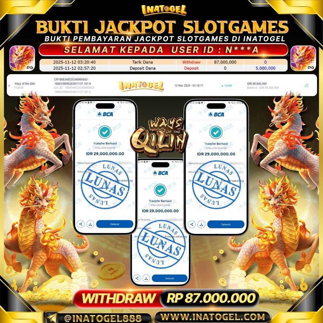 Selamat kepada User Id N***A telah berhasil mendapatkan kemenangan jackpot pada permainan SlotGame Ways of the Qilin sebesar Rp87,000,000,- . Inatogel situs terpercaya sejak dulu hingga saat ini , Untuk kemenangan berapapun pasti akan kami bayarkan . Jangan ragu bermain di Ina Togel . Kami pihak Inatogel Menyampaikan terima kasih kepada seluruh member Ina Togel yang telah Percaya dan setia Bersama kami bermain di Inatogel saat ini.